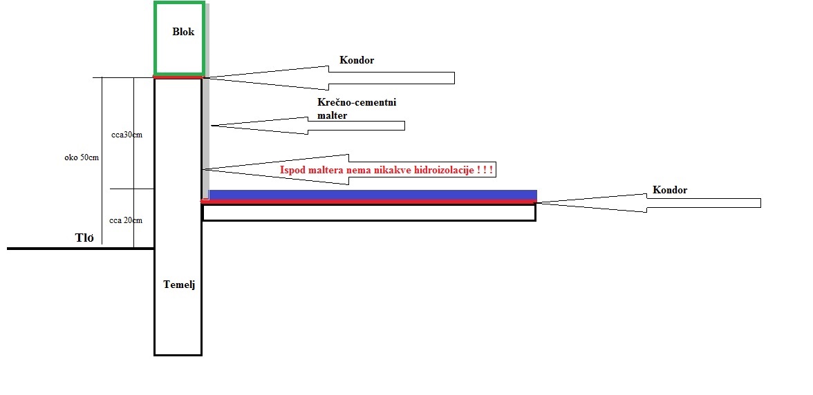 Stopa trakastog temelja je oko 80cm ispod nivoa tla. Nadzemni delovi temelja vire 50cm iznad tla. Unutar prizemnih prostorija livene su nulte ploče (na nivou od oko 20cm iznad tla) a preko njih lepljen kondor. Na horizontali temelja koji vire iznad tla je lepljen kondor i na njega zidano blokovima (skica u postu 43.). Upravo je postojeći problem vertikala temelja u širini od oko 30cm na kojoj ne postoji nikakva hidroizolacija već je taj deo bio samo omalterisan i na njemu se delimično javila buđ 2014. nakon dugih i jakih kiša. Napominjem da je 2012. godine došlo je do curenja pocinkovane vodovodne cevi koja je prolazila ispod objekta