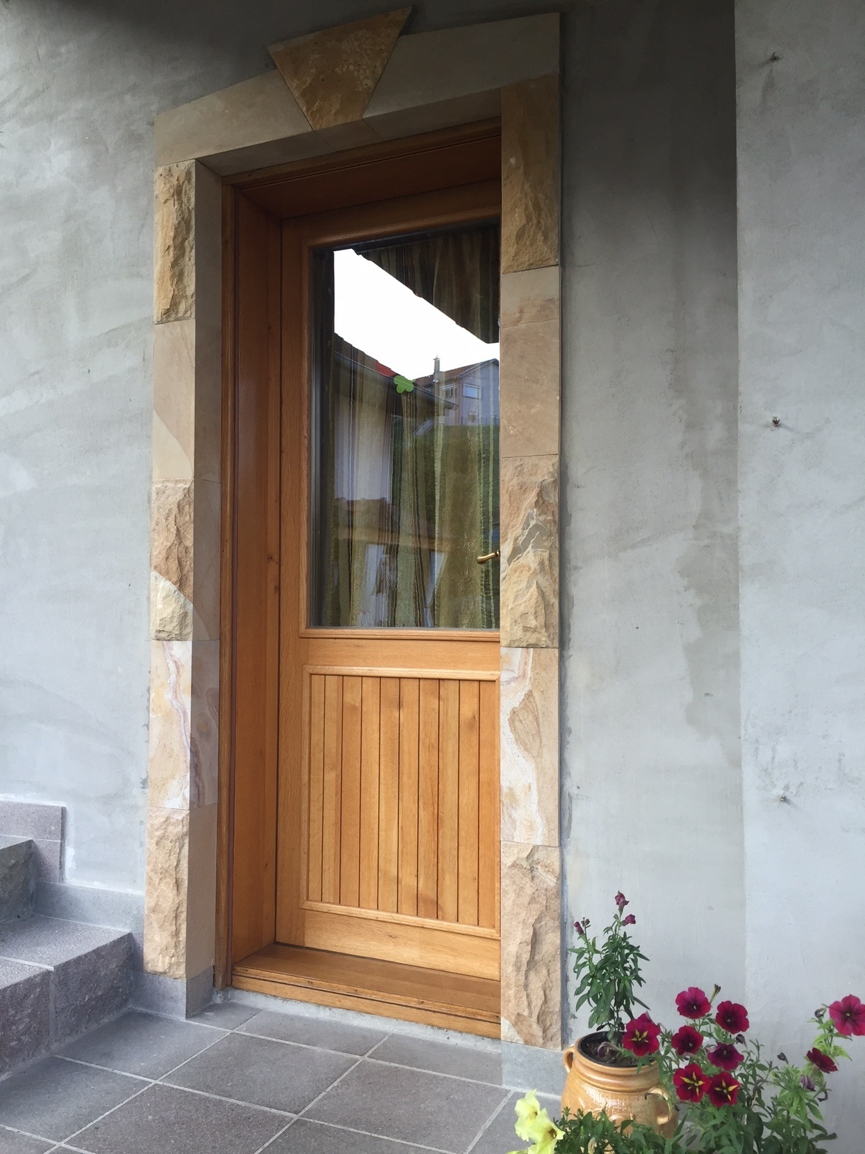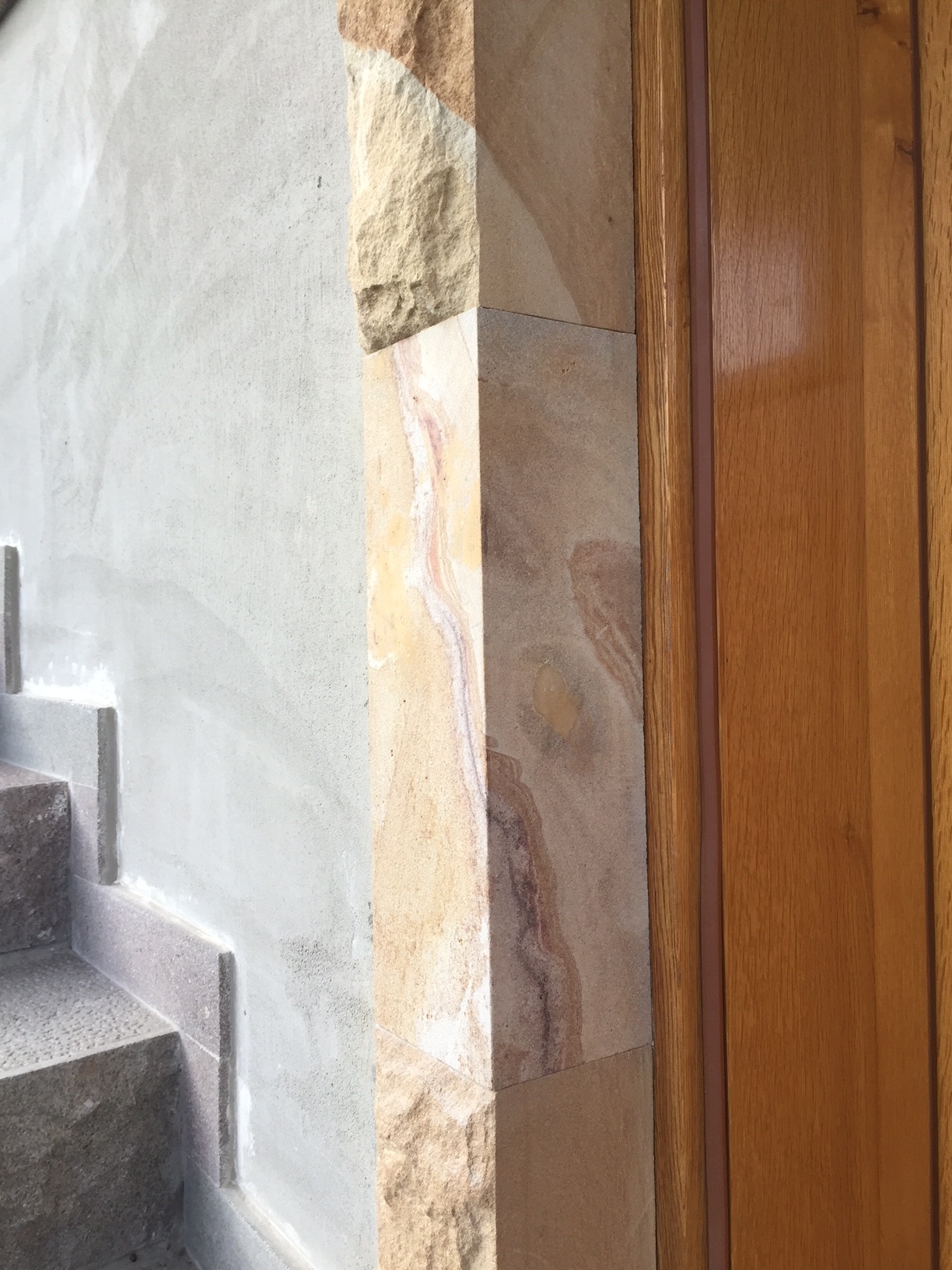 Ima još bitnih stvari: pri ugradnji kamena strogo sam vodio računa o tome da ne izgubim efekat izolacije. To znači da kamen i lepak kojim je zalepljen nemaju nigde dodirnih tačaka sa nosećim zidom, već je kamen lepljen samo na stiropor. U potpunosti sam izbegao tzv. hladne mostove. Vertikale principijelno nisu problem jer se one naslanjaju na neki serklaž/trotoar/temelj bilo šta. Problem su nadvratnici i tu sam vodio računa da bočni komadi budu naslonjeni na vertikalu a srednji završni komad je tako napravljen da je oslonjen na spomenute bočne komade. Ideju sam preuzeo od starih majstora iz vremena kada nisu postojali beton, lepak i betonsko gvožđe. Preciznost u rezanju i obradi mora da bude filigranska.