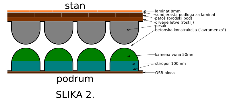 Deo koji me muci je izolacija poda. Iz vise razloga sam se odlucio za izolaciju sa podrumske strane, da ne ulazim u detalje. Na prilozenim slikama je prikazano trenutno stanje (slika1) i ono sto mislim da uradim sa tom podrumskom tavanicom (slika 2). Na kombinaciju kamena vuna/stiropor sam se odlucio zbog nepravilnog (polukruznog) profila tavanice. Slika nije bas u pravoj proporcjii, sada to vidim, ali luk je dubine nekih 50mm, otuda ideja kamena vuna 50mm + stiropor 100mm + stiropor 100mm = 250mm, sto je i dubina cele kontrukcije. Za OSB ploce sam se odlucio jer je visina podruma oko 2.1 m, tako da svaka potkontrukcija smanjuje visinu, a kako moram da osim svog odradim i jos 4 komsijska podruma, nije prakticno ni korektno previse smanjivati visinu plafona.