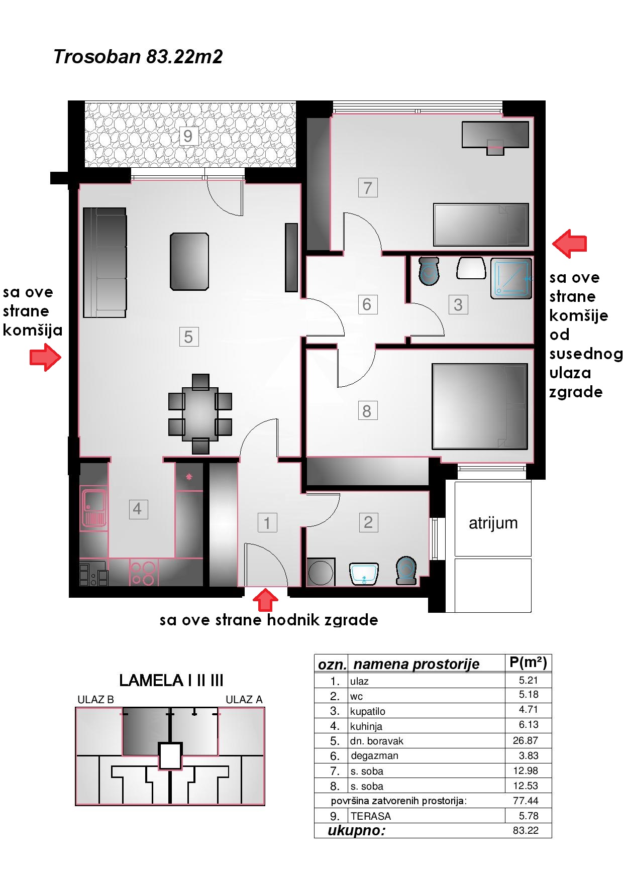 kao sto se da primetiti nov sam ovde i nadam se da ce neko dobrim savetima uspeti da mi pomogne da resim problem koji imam. Naime kupio sam stan od 83 kvadrata na prvom spratu u pitanju je novogradnja, dve godine nije bilo problema dok nisu pocele druge komsije sa useljavanjem kao i lokal ispod mene sa radom. Da bi bilo jasnije prilozio sam i skicu stana. Naime planirao sam da radim zvucnu izolaciju i pitam se koliko ce to resiti problem. Uradio bih spusteni plafon u svim sobama sa azmafonom, kamenom vunom i gips plocama, imam ponudu od 18e po m2 a takodje bih radio i zidove koji se granice sa komsijama kao i one prema spolja, pored toga pitao sam se da li bih mogao da preko postojeceg parketa stavim neku zvucnu izolaciju pa preko toga laminat i koliko bi sve to pomoglo. Naime ispod mene je decija igraonica i buka je veoma podnosljiva kada nema rodjendana dok kada su rodjendani to je uzasno, pokusao sam sa prijavama svim inspekcijama ali ne pomaze ipak to cu verovatno resiti tako sto cu u narednih dva-tri meseca uz porodicnu pomoc kupiti taj lokal i njega izbaciti napolje i lokal kasnije izdavati ja ali to sigurno nece biti bilo kome ko pravi buku. Na moju zalost stan pored mog nije jos uvek useljen a i on se nalazi iznad igraonice pa nemam sa kime da udruzim snage u borbi. Ipak predpostavimo da resim pitanje lokala ja bih ipak radio pomenutu zvucnu izolaciju u svom stanu od ostatka komsiluka koje cujem ne previse ali se pitam sta ce biti kada se doseli komsija iznad mene i pored jer i ovako cujem komsije iz stana ukoso iznad mog kada hodaju a ponekad i kada bude neke vike i slcno. Takodje cujem komsije kada oko ponoci vrse malu nuzdu a iznad mene nema nikoga kao ni ispod pa je pitanje odakle zvuk dolazi, verovatno iz stana u susednom ulazu jer su oba ulaza sleplena i svi stanovi su uradjeni u obrnutom rasporedu od drugog ulaza. Takodje iz kupatila koje je izmedju dve sobe se cuje kada se pusta voda i to je cujem jos kad krene sa treceg sprata a u trenutku kada prodje kroz moj kao bomba