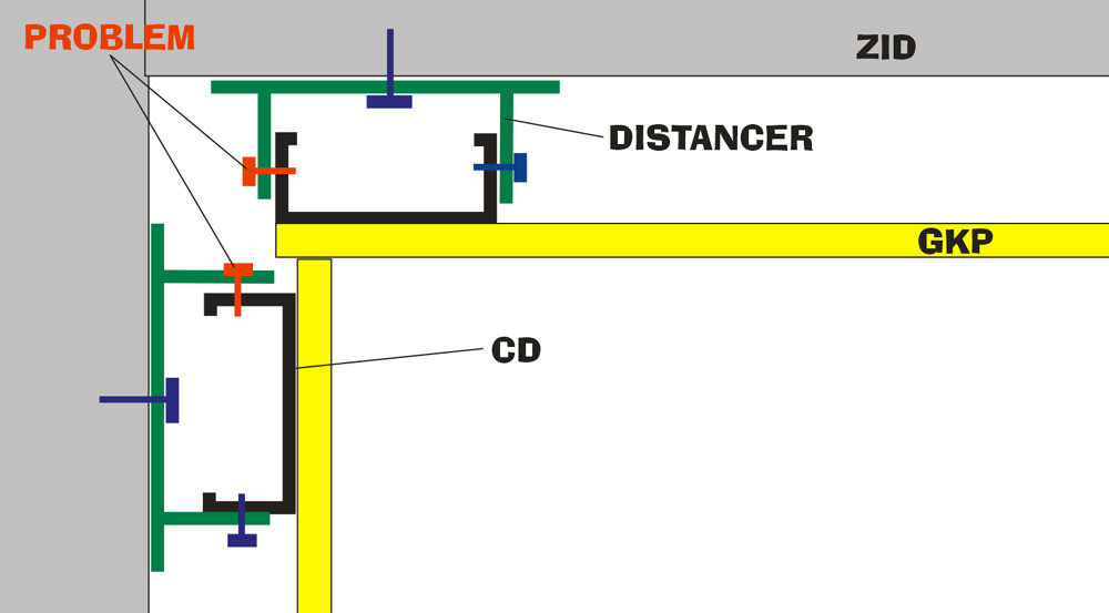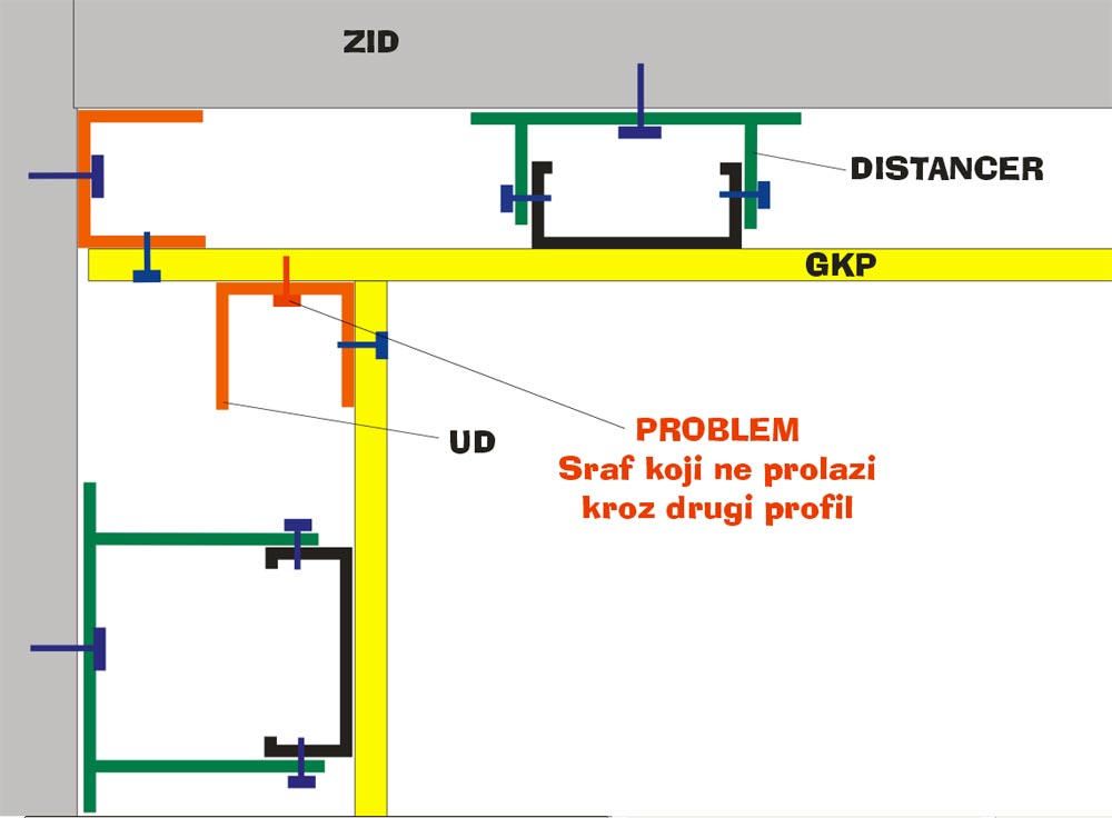 Muci me izgradnja coska od gkp-a. Inace spremam se da napadnem jednu staru kucu i da postavim rostilj od celicnih profila na koje bih posle srafio gkp ali ne znam kako da uradim cosak. U patos cu da utiplujem ud profil i da vertikalno slazem cd profile koje cu distancerima odvajati od zida i srafiti holsrafima. Muce me srafovi prikazani na slici (crveni) njih od zida ne mogu da usrafim i onda se taj cd profil klima....Mozda je ova varijanta pogresna i imam jos jednu na umu ali ni ona nije dobra....Ljudi kako se pravi cosak?