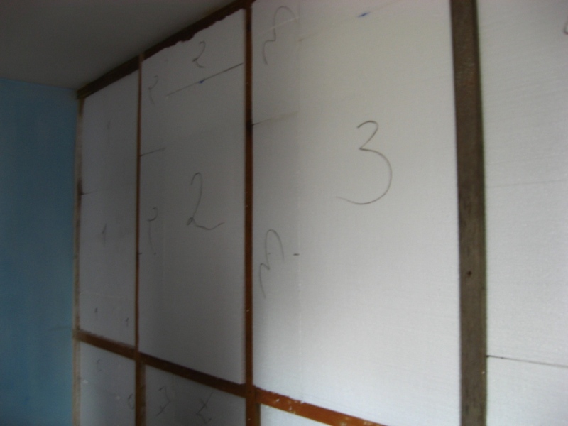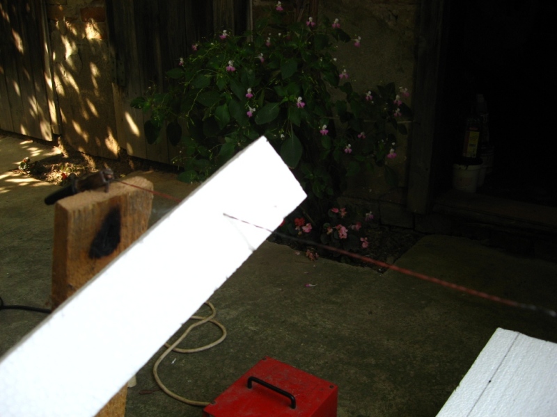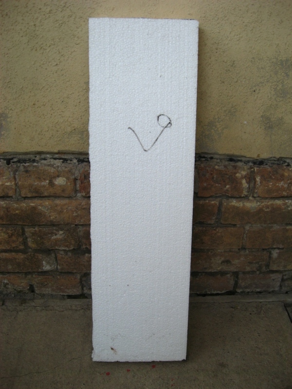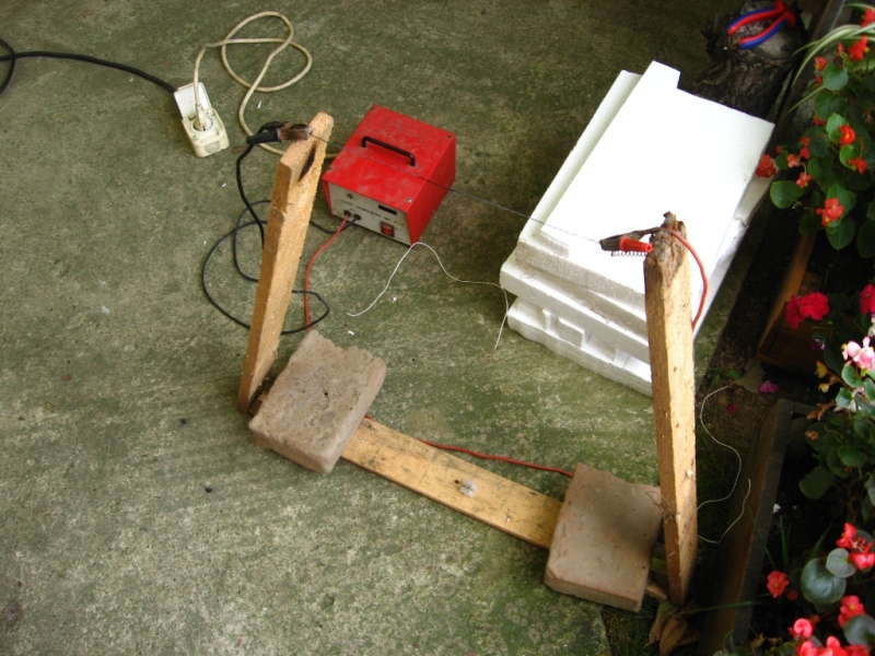 Nakon raščišćavanja došao je red da se postavi stiropor od 5 cm i od 3 cm, koji je morao da se seče jer su praznine 70 cm x 120 cm. Pošto nisam hteo nered i stiropor po celom dvorištu, napravio sam mašinu za sečenje sa vrućom žicom o kojoj sam čitao ovde na forumu. Napravio sam drveni ram, razvukao žicu i povezao na punjač akumulatora od 12 V. Žica se usijavala čak je i drvo progorela ali nisam tu mogao ništa. Smanjio sam malo temperaturu dodavanjem druge žice koja nije imala nikakvu ulogu u sečenju. Sekao sam relativno pravo ali u nekim situacijama kao bura na moru. To bi se dalo ispraviti da je žica bila zategnuta ali pošto je ram bio klimav tako je kako je.