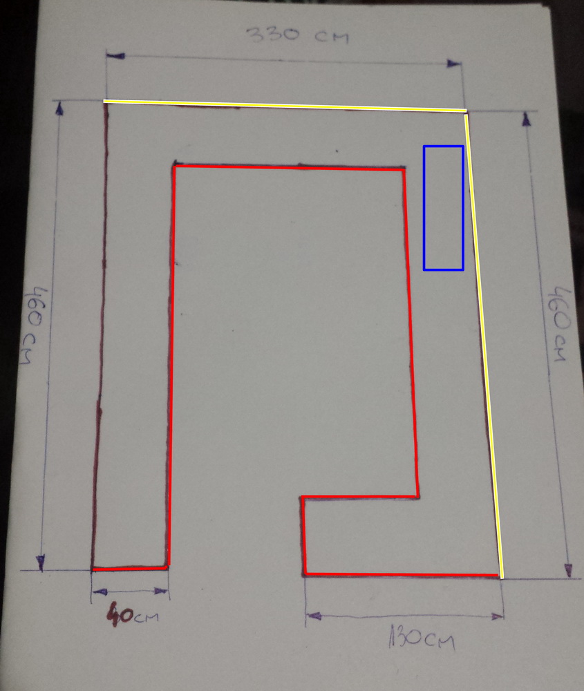 evo slika otprilike kako bi to trebalo da izgleda, tj. u kom obliku.... zutom bojom su oznacene strane zida koje su uradjenje od gipsanih tabli (ovo sam naglasio jer ne znam dal se ud profili mogu pricvrstit udarnim tiplama s obzirom da nije betonski zid), s tim sto bi na jednom zidu klimu trebalo spustit nekih 10 cm (klima je inace ovo plavo na slici i ona se nalazi na gipsanom zidu)