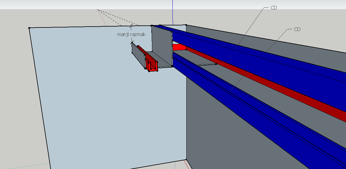 Gornje profile pustiš celom dužinom, a gips ploča ide samo koliko je crvenom bojom (prikaz je odozgo, sivo su profili)