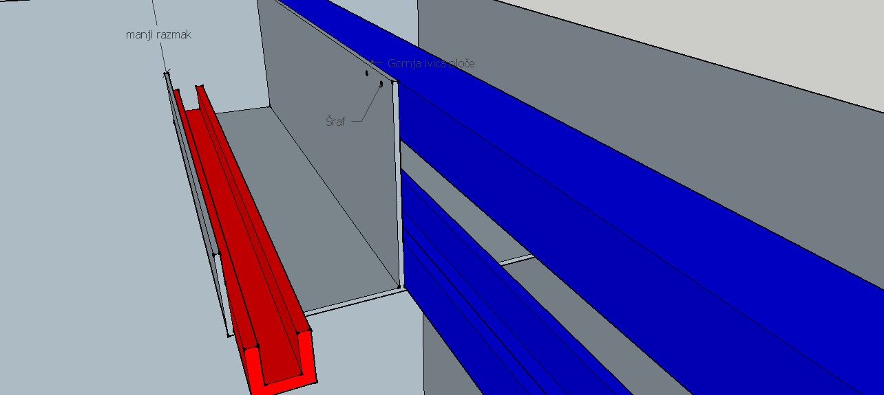 Drugu stranu (levu) pustiš ploču da se uhvati za profile od crvene, ali njene profile pustiš samo da dođu do crvene.