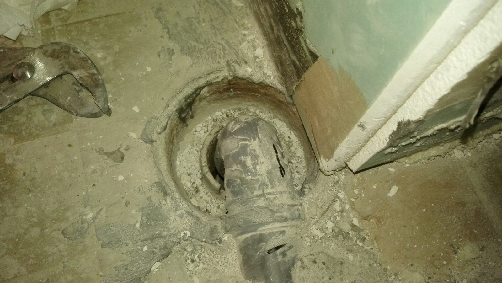 Ево како су цијеви постављене. Могло се ту уштемати у плочу тек толико да стане цијев. Такође, прочитах на форуму да људи мијењају и овај метални кружни сливник испод решетке који је око ове цијеви што вири из пода. Ја сам мислио да је то заједно, али како сконтах то сто вири је цијев, а ово око ње је одвојено од цијеви.
