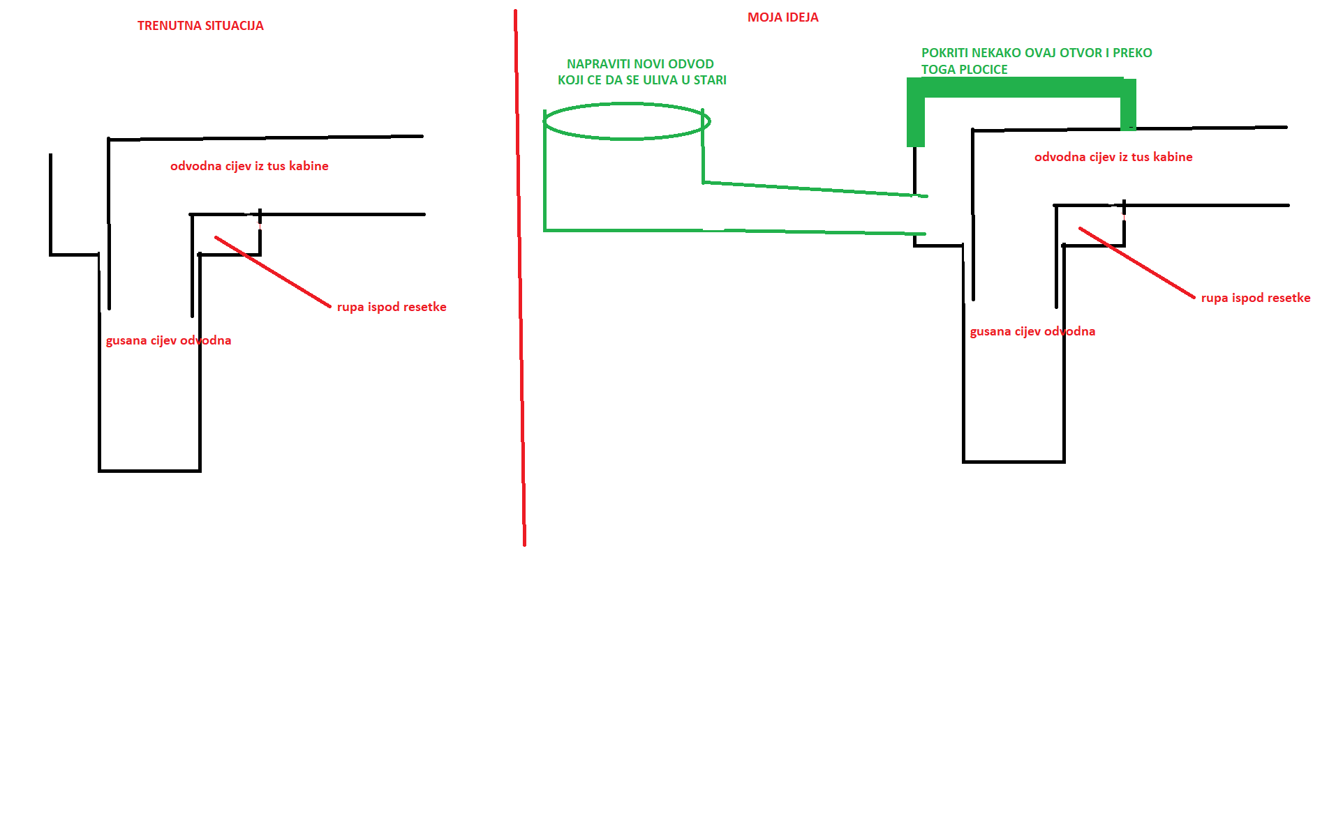 Наравно да ми је јасно да гусану цијев не могу да помјерим (ову цијев која иде у под) али размишљам да само покријем и хидроизулујем овај отвор а да са стране у њега надоградим други сливник који би онда био решетка.