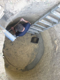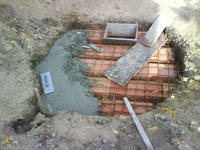 Zidanje se nastavilo sve dok jedan red cigle nije presao preko kanalizacione cevi.Tad su iznad cevi stavili armaturu da je cigla ne bi polomila i zavrsili zidanje.Ovako izgleda ozidana septicka jama : dubina 2.5 metra, precnik 2,3 metara , potroseno 730 komada pune cigle i troje kolica maltera (mozda nekom vredi ovaj proracun). Dodjosmo do ploche...