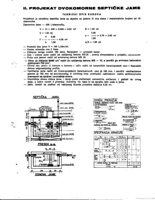 e sad i ja nesto da kazem . kos ebavi ovim poslom znace o cemu pricam .al je poenta u sledecem . septicka jama ima jos jednu namenu pored skupljanja otpadnih voda . a to je da se usamoj jami vrsi raspad i prerada otpa i da iz jame otice razlozen otpad .znaci u jami se vrse dva vrenja prvo aorobno ili metansko vrenje i drugo anaerobno..glavna fora je da iz jame otice "nenatrula" voda i razlozene organske materije.konkretno na vasoj jami je napravljen veliki propust .poredjanu mont gredice od blokova .i preko njih je liven beton .zbog velike kolicine kondenza i kiselih gasova vrlo brzo 1-2 godine doci ce do pucanja tih blokova koji su direktno izlozeni dejstvu gasova a samim tim i do obrusavanja zemlje ispod betonske ploce i ploca ce ostati da visi u vazduhu . i da napomenem sto je ploca deblja to je i teza pa ce blokovi jos brze pucati. i za par godina ce poucati i sama ploca jedina uteha jeto sto je ploca armirana pa nece biti opasnosti da pukne i da neko upadne ali i to je moguce . zato se ploce liju na salung (daske ) direktno uz dodatak aditiva za vodonepropusnost betona i time je problem resen za bar 50 god .i sto armiranja tice mali savet svima:ukoliko je presek armature u ukupnom preseku betona manji od 4 % beton se smatara NEARMIRANIM