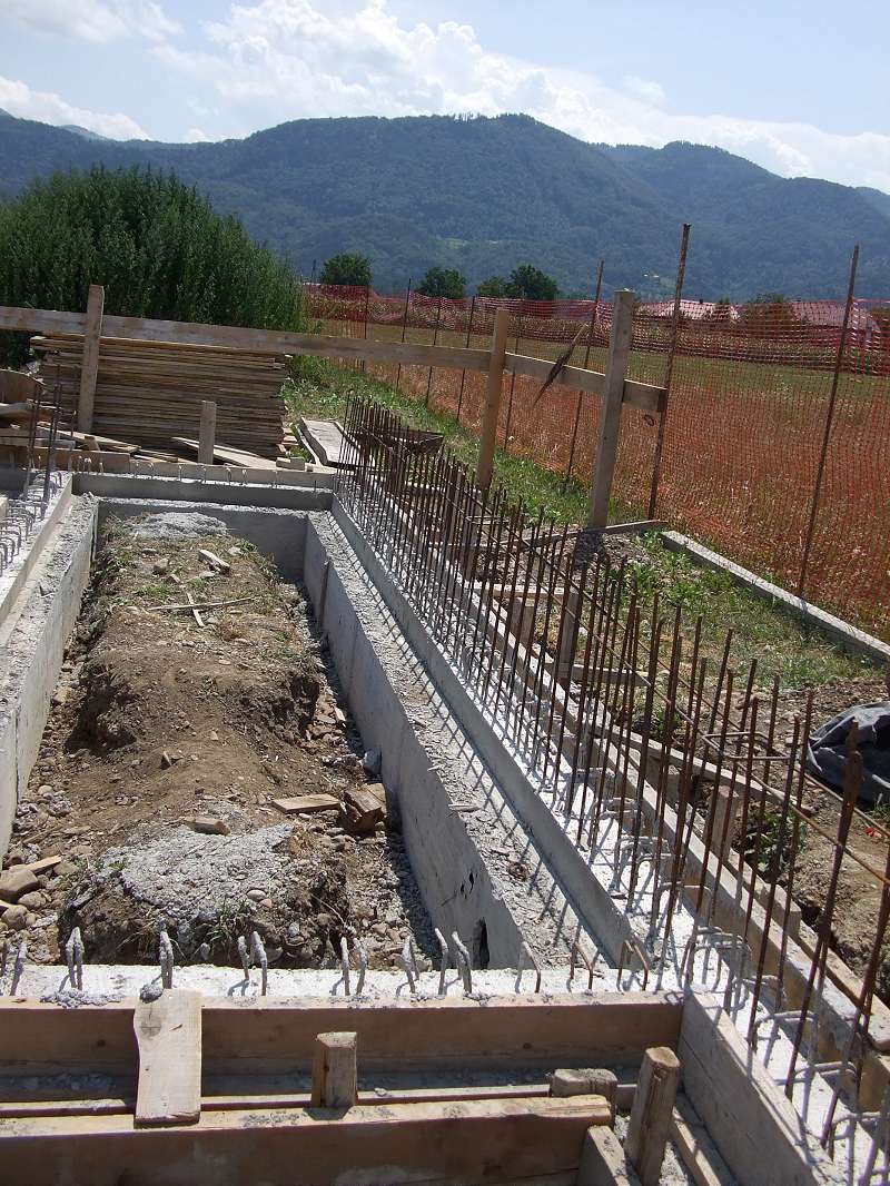 2.) Napraviš opaž za beton, ugradiš armaturo i zaliješ temelje do visine "dna" AB ploče. Ugradiš tampon/šljunak in ga nabiješ u plasteh po 20-25 cm do visine , dna AB ploče. Kakvu vrstu armature za sidrenje ti je projektant -statik izrisao , trebaš sidra zaokrenit dolje; obično se tu ugrađuju dvije cone MA ; sama mreža ide/nalježe na temelje preko , do vanjske oplate, koja je ostala po vanjsk liniji. Onda se to zabetonira. Na samom stiku temelja in AB ploče, malo napravimo šregu.