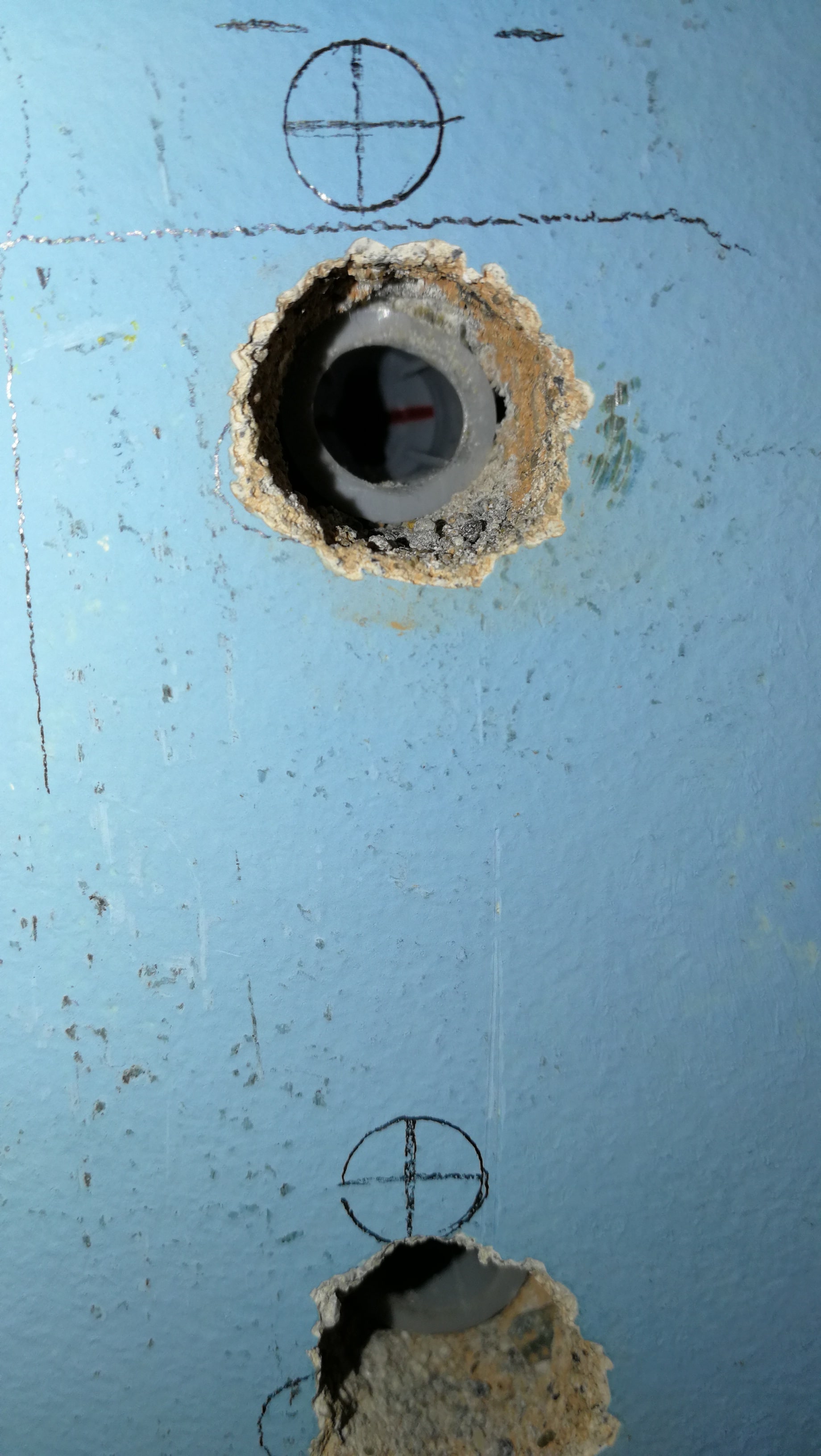 Jedan zid je noseći, betonski sa 3.5cm maltera, zajedno sa malterom sa obe strane debeo oko 30cm. Drugi zid je pregradni, od pune cigle sa 2cm maltera, ne znam koliko je debeo, sigurno je tanji od nosećeg, moraću sutra ujutru da vidim sa komšijama, ne znam koliko smem duboko da bušim.