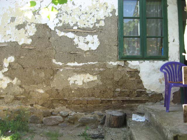 Pored stubova, vratai prozora ima velikih zazora i po 2 - e4- santimetra jer se sve to sušilo, raušivalo, razilazilo, krivilo ( nailazim na stubovesa korom i ubeđen sam da je stavljana sirova deljana građa) i jedan zid sam radio glinom i to bez pleve. Ipak bio sam lukav pa sam metnuo staklenu mrežiciu i nju opet namazao tankim slojem blata.Trudio sam se da je dobro nabijam u šupljine. kad se osuši ispuca napravi se neki površinski mozaik pukotina, ali ja se ne prerdajem, razmutim glinu u vodi, napravim kašu kao jogurt pa onda četkom mažem po onoj osušenoj glinenoj površini. Trljam, utrljavam, menjam pravc,menjam smer, menjam i pritisak i ispade to sasvim solidno. negde sam ubacivao i lepak za drvo, negde sam umesto vode dodavao neku podlogu koja nalikjuje na mleko ili jogurt. Sve u svemu nije neki trošak, ali drži već nekoliko godina.