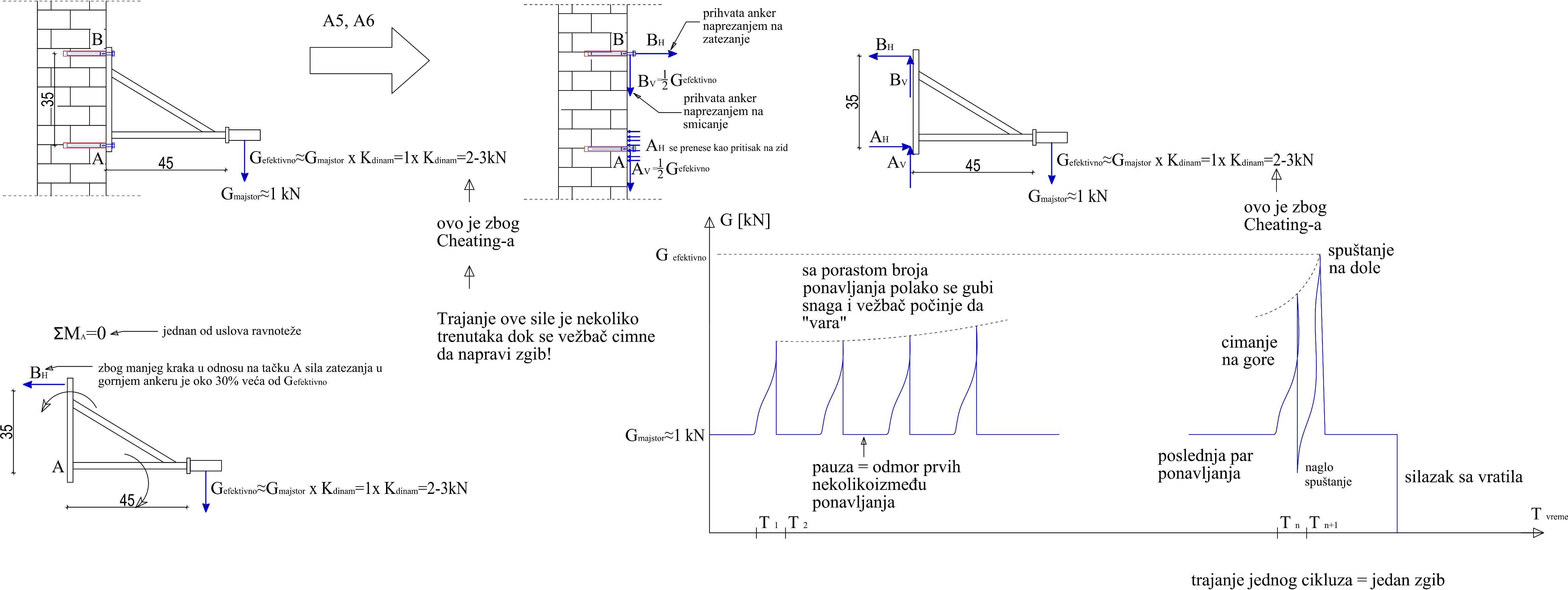 Napravio sam malo objašnjenje zašto je kačenje vratila obično problem i zašto u teretanama je obično u sastavu kaveza ili kao posebna sprava sa svojom konstrukcijom koja leži na podu. Većini ljudi se čini da je težina vežbača otprilike kao da okačite bojler od 80l ali nije. mnogo je nepovoljnije jer prilikom vežbanja se prolazi kroz nekoliko faza na početku serije vežbač je odmoran i relativno ispravnim pokretom radi vezbu tom prilikom kada se rukama vuče na gore javlja se određeno povećanje njegove težine (masa mu je stalno ista i to je oko 100kg) ali efektivna vertikalna sila kojom on vuče vratilo je njegova težina koja je oko 1kN ali multiplikovana nekim dinamičkim koeficijentom. Mi neznamo koliki je on ali on raste kako odmiče serija i verovatno može da bude i nekoliko puta (1.5, 2 ili 3 - ovo može da se izmeri). Kako se vežbač zamara polako počinje da se se sve više cima, nepravilno izvodi vežbu - žrtvuje tehniku zarad broja ponavljanja.Poslednja nekoliko ponavljanja su najproblematičnija jer kada se spušta vežbač nema snage pa se jednostavno pusti na dole tada je "cimaj" i dinamički koeficijent najveći. ovo variranje sile pravi zamor na vezi ankera i zida i mnogo je problematičnije nego kad okačite bojler ili kuhinjeski element koji stoje samo kao mrtav teret