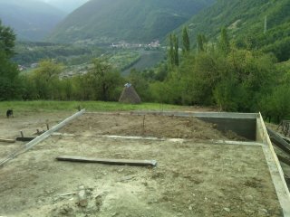 U tri stope dimenzije 80 Xc60 x 40 cm je stavio armaturnu mrežu i izvukao serklaže prema gore.Također je u ove zidove od terase je stavio mrežu "5".Navučena je zemlja, nabijena vibratorom, pa sloj sitnijeg kamena, nabijen isto vibratorom.