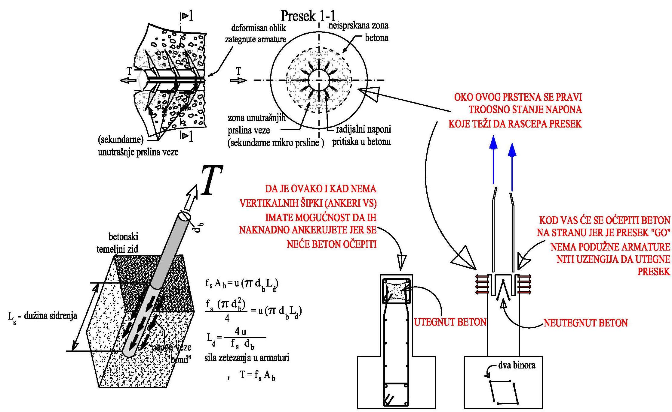 Od naknadnog ankerovanja vertikalnih šipki za VS nema ništa jer je Vaš beton "go" nije utegnut i ne može da trpi bočno zatezanje. Oko šipke koja je zategnuta se u betonu formira prsten u kome armatura vrši počni pritisak a to se ustvari manifswtuje kao bočno zatezanje u betonu. Tako da bi se desilo da bi se raspukao beton na stranu, očepilli bi se delovi betona na mestu gde biste ubušili rupe i pokušali da naknadno ankerujete...Pokušao sam da slikom vam objasnim zašto to ne može da se uradi a da bude dobro.