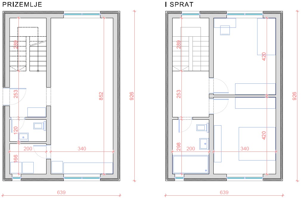 U pitanju je spratna kuća, osnova temelja 6.39m širine i 9,26m dužine, bruto kvadratura ~118kvm