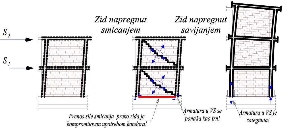 Inače armatura VS se značajnim delom aktivira u vidu trnova koji prenose smicanje kod zidova koji su smičući izolovani bitumenskom HI. Kondor delimično slabi nosivost zida na smicanje pa se ono prenosi vertikalnim serklažima kod kojih je vertikalni kontinuitet nekompromitovan.