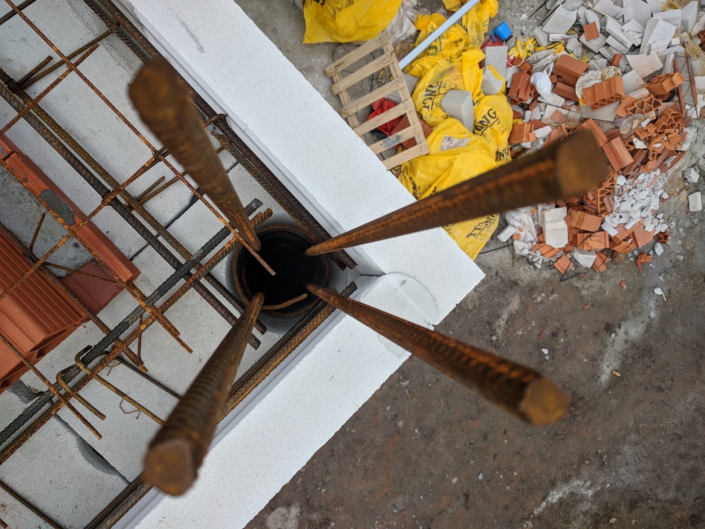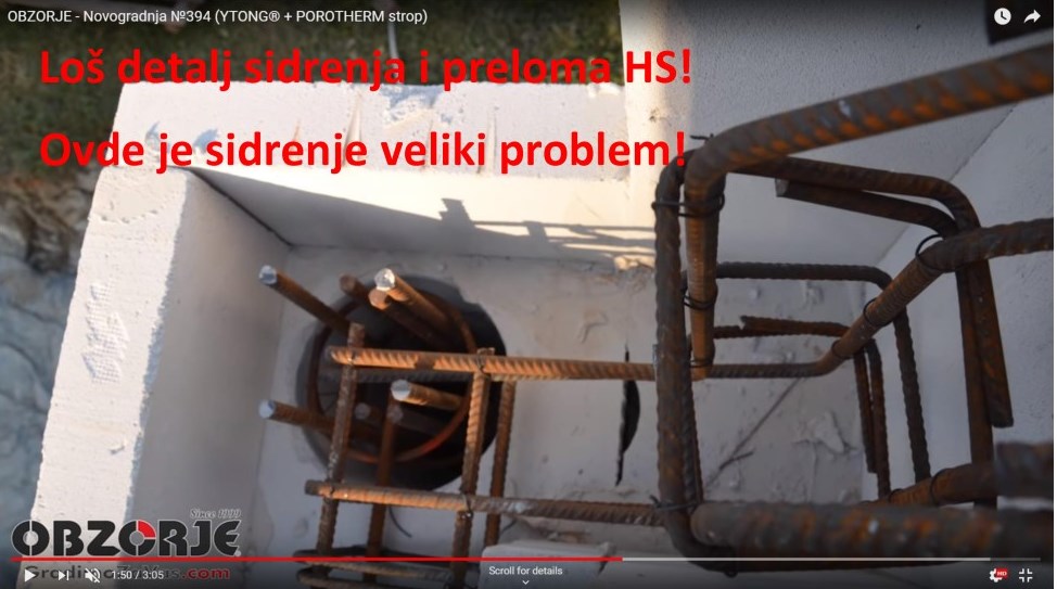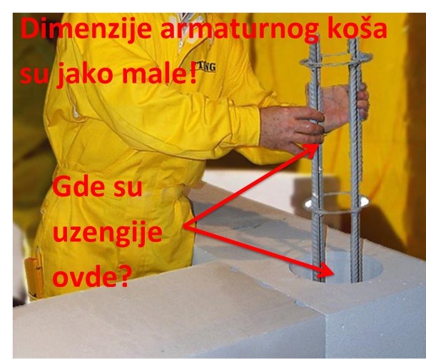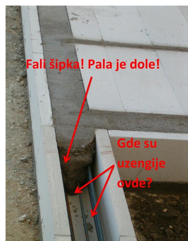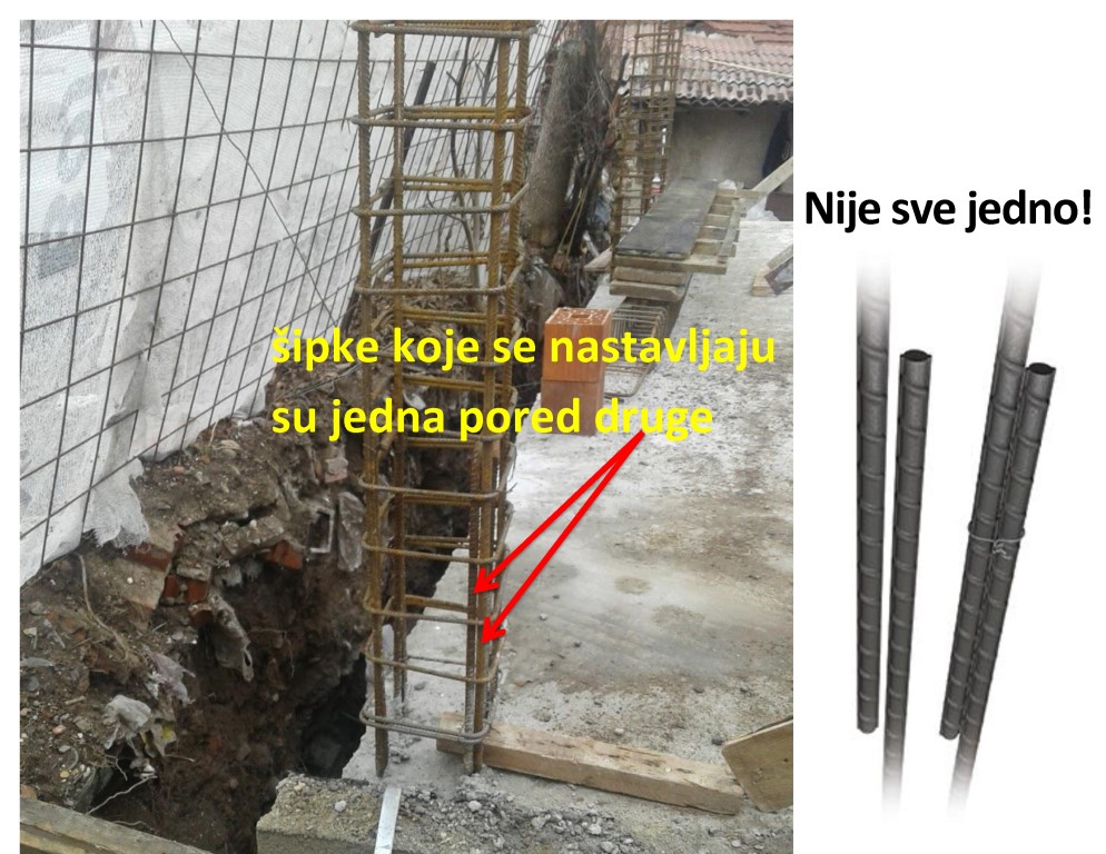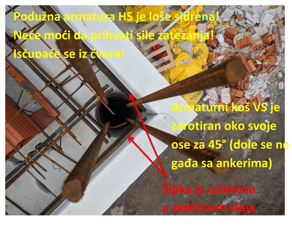 Da li je nekom palo na pamet da kad se vertikalni serklaži izvode klasičnim postupkom (ozidaju zidovi, ugradi armatura, a na posletku se tek zatvara oplata i betonira) pojedinačne šipke koša VS se namerno postave pored istih takvih šipki koje su ostavljene kao ankeri iz temelja ili sa prethodne etaže za sledeću. Vežu se paljenom žicom i pritegnu jedna uz drugu! Kada se koš naknadno spusti šipke ne stoje jedna pored druge već su na određenom rastojanju. Transverna zona se povećava i to zahteva veću dužinu sidrenja. U zoni nastavka je teško obezbediti da uzengije siđu do dole pa je efekat poprečnog utezanje slab što takođe nepovoljno utiče na kvalitet sidrenja. osnovna stvar je da se armatura pre betoniranja vizuelno pregleda a ovde niko pojma nema šta je dole ali zato lepo izgleda zid spolja...
