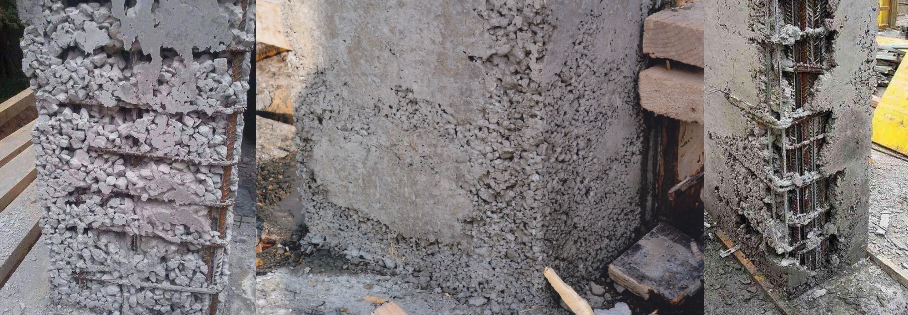 Kad se pogleda odnos prečnika uzengije i rupe u bloku stvoreni su uslovi za nastanak segregacije betona usled efekta zida. Betonira se sa velike visine pa beton pada i udara od armaturu i segregacija se pojačava. Efekat rešetke nije verovatan. Sa snimka se vidi da sama zona nastavka armature VS je bez uzengija što beton ostavlja ne utegnutim pa je nastavak još lošiji. Zapravo i nemamo pojma kakav je. Ovo može da bude problem kod većeg broja etaža i visokog zida kad će podužna armatura VS biti zategnuta.