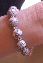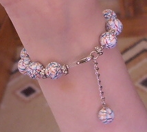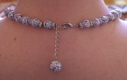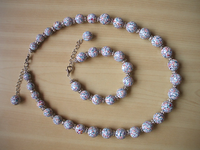 Uzela sam beli fimo, napravila 'spljosteni' valjak, veca baza a mala visina. Onda ide po malo od raznih boja fima: crvena, narandzasta, zelena, plava, teget, ljubicasta... To prodje kroz pasta machine, ne skroz na tanko, ali onako, malo tanje. Onda seckas valjak, ali onako kao da hoces da dobijes dijagonalni presek, u raznim pravcima, i tu umeces ove boje, dakle, preseces valjak, uzmes jedan deo, stavis na plocicu od neke boje tako da spustis dijagonalni presek valjka, tj. pravougaonik na taj listic neke boje, opseces u krug tako da i taj listic bude pravougaonik odgovarajuce velicine, i na kraju to fino spojis sa drugim delom valjka, tako da, kada ga pogledas odozgo, tj. u onoj projekciji u kojoj izgleda kao krug, dobices krug presecen jednom linijom neke boje. I tako ga seckas kako hoces, umeces boje, igras se u sustini, ne moras uvek da sastavis onako kako si isekla, mozes jedan deo valjka da zarotiras za 180 stepeni pa tako da spojis... I na kraju ga stanjis, redukujes cane na velicinu koju zelis, seckas ga i obmotavas kuglice.