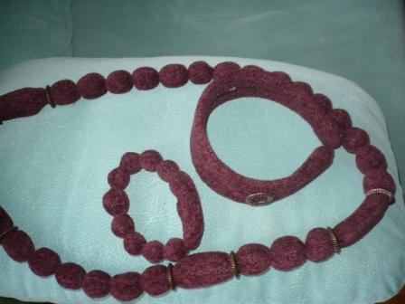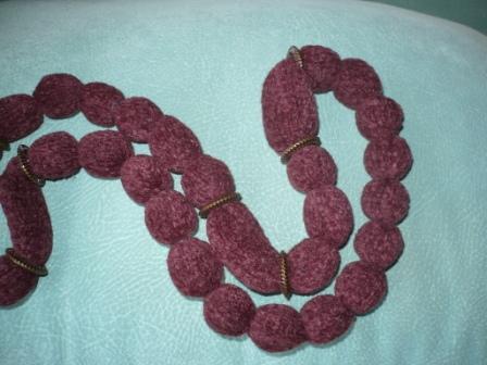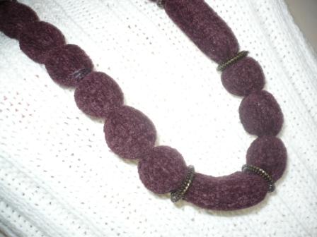 Ja sam ove ogrlice radila prošle godine, uputstvo je bilo u nekom našem časopisu što je kratko izlazio. Te u časopisu je radila neka naša slikarka od sirove svile sa srebrnim alkicama između svake kuglice, a ja sam svojoj ćerki napravila ( ona je zove plagijat ogrlica ) ovako: na šivaćoj mašini sašijem crevo, okranem ga na lice, umesto kuglica smotuljci vate, umesto alkica srebrni konac koji obmotam čvrsto nekoliko puta pa ga ne prekidam, nego se pruža preko kuglice do sledećeg namotavanja. Na kraju veliki privezak - pločica od plastelina koji se kuva. Ako ste razumeli šta sam htela da kažem