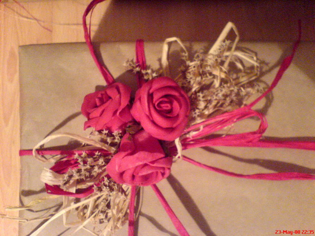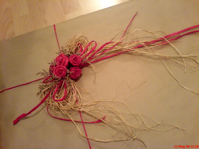 Hvala jos jednom na pozitivnim kritikama. Materijal sam skupila sa svih strana, a nesto sam pronasla i u svojoj kuci, pa je ispalo to sto je ispalo. Ruzice nisu mojih ruku delo, a volela bih da jesu. Koliko se secam one su od neke sundjeraste mase napravljene, ali kako, to ne znam.