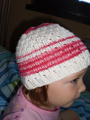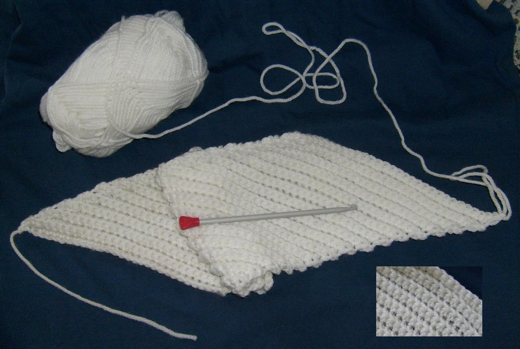 Gotova dužina (imala sam oko 65 redova) za obim glave se potom spoji u pravougaonik. Ko ume, to radi kukičanjem, ja sam spajala iglom i nije mi baš najbolje ispalo. Ideja je potekla od jedne pufnice .