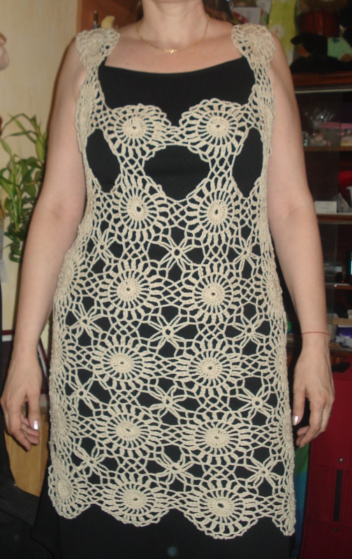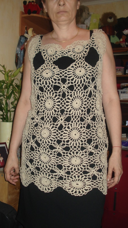 @lutajuca,ja sam ove krugove smanjila za 2 zadnja reda(bili su suvise veliki)Precnik mog kruga je 13 cm i mislim da cu raditi 6x8.Za ovo sto sam uradila otislo mi je malo vise od 100 gr a planiram jos 150-suma sumare-250gr.Stavljam sliku velikog kruga a ovo izmedju sam sama smislila jer mi je u originalu mnogo gusto.Jos detalja za tuniku mozete pogledati http://club.osinka.ru/topic-78696