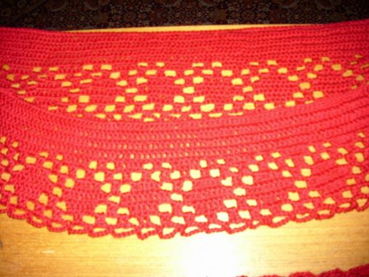 Zaboravih da vas pitam za savet-razmisljam da oko vrata radim heklicom a ne iglama-nesto mi se ova ranfla ne uklapa u letnju varijantu.Razmisljala sam da je obradim kao rukave.Jos nesto-po dnu bih ostavila ove krugove a ne ravno-tada bi ispali neki talasi od polukrugova.Al se ja gadjam recima