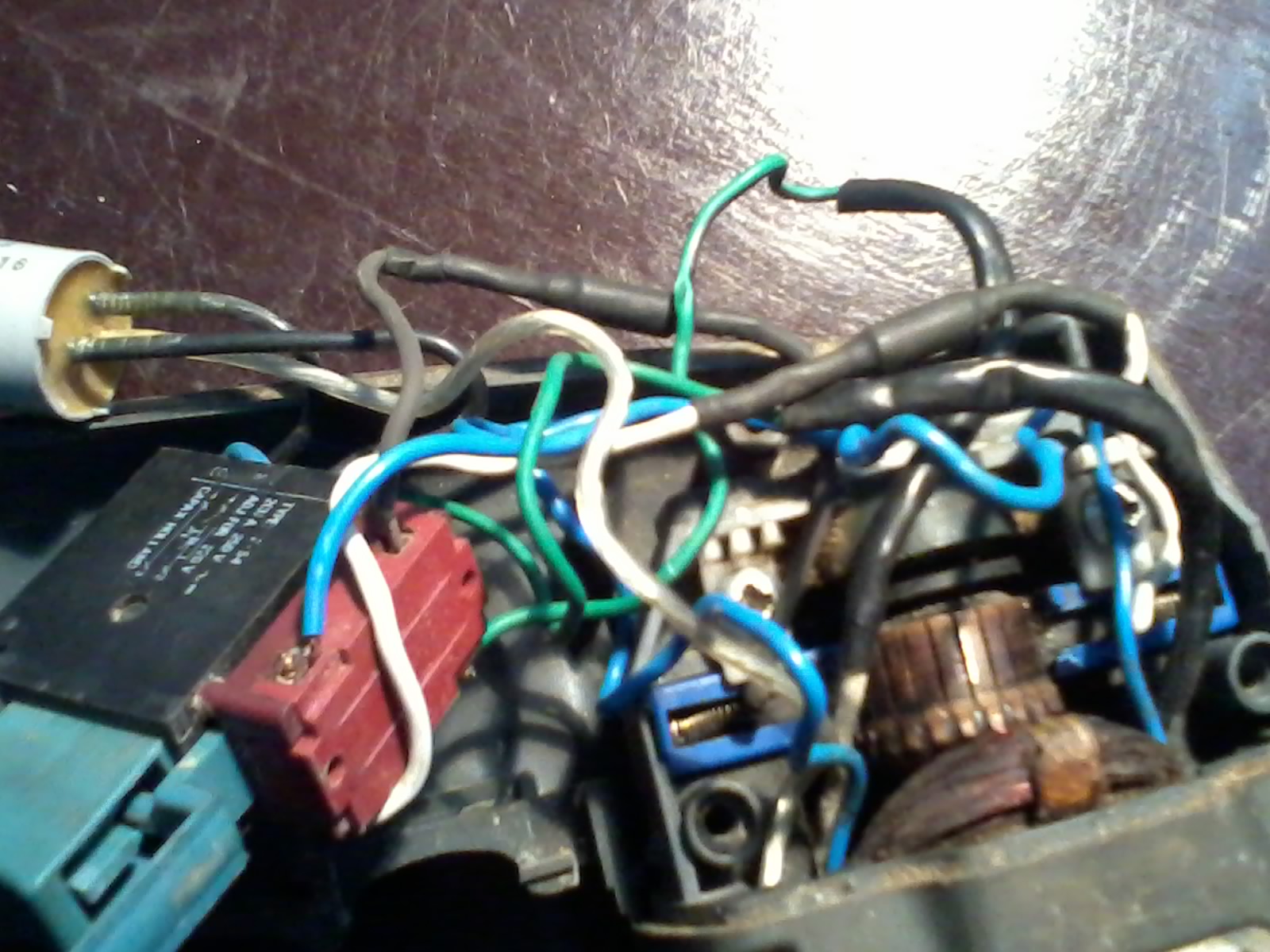 Sa gornje srane prekidaca (ovo crveno na slici) izlazi plava i zelena na stator a crna i bela na po jednu cetkicu. Ima jos jedna providna koja izlazi iz konezatora i ide na stator. Kad kazem na stator sve ulaze unutra u deo koji nisam rasklopio ali mislim da se zavrsavaju na raznim krajevima statora.