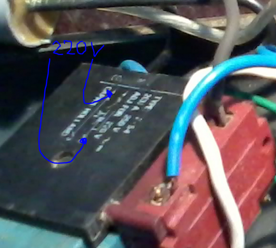 Braon iz dovoda ulazi u prekidac sa donje strane. sa donje strane izlazi jedna crna u kondezator i jedna zelena ide u stator. plava iz dovoda ide sa strane prekidaca i sa te strane iz iste rupe izlaze crna na kondezator a plava na stator