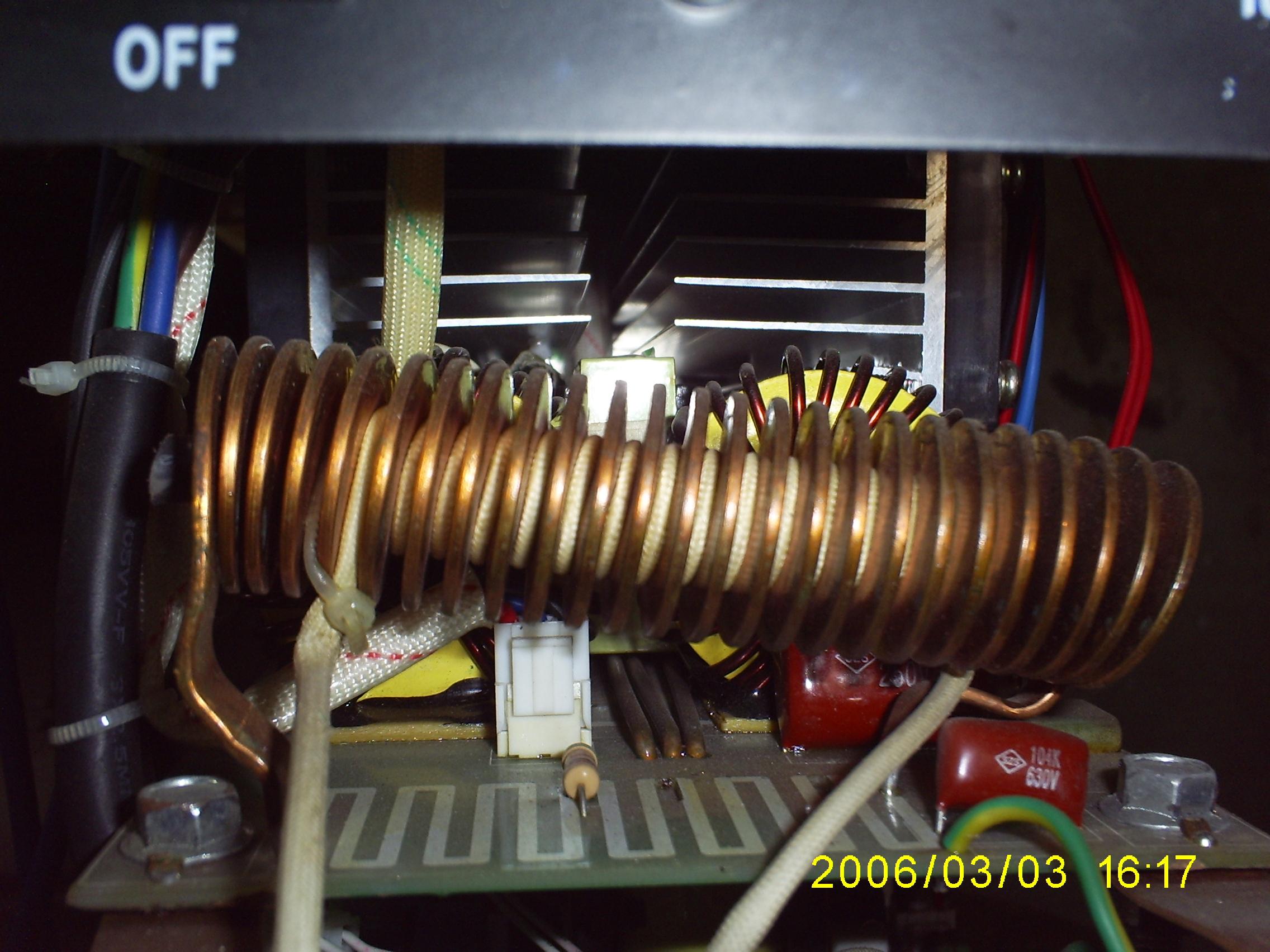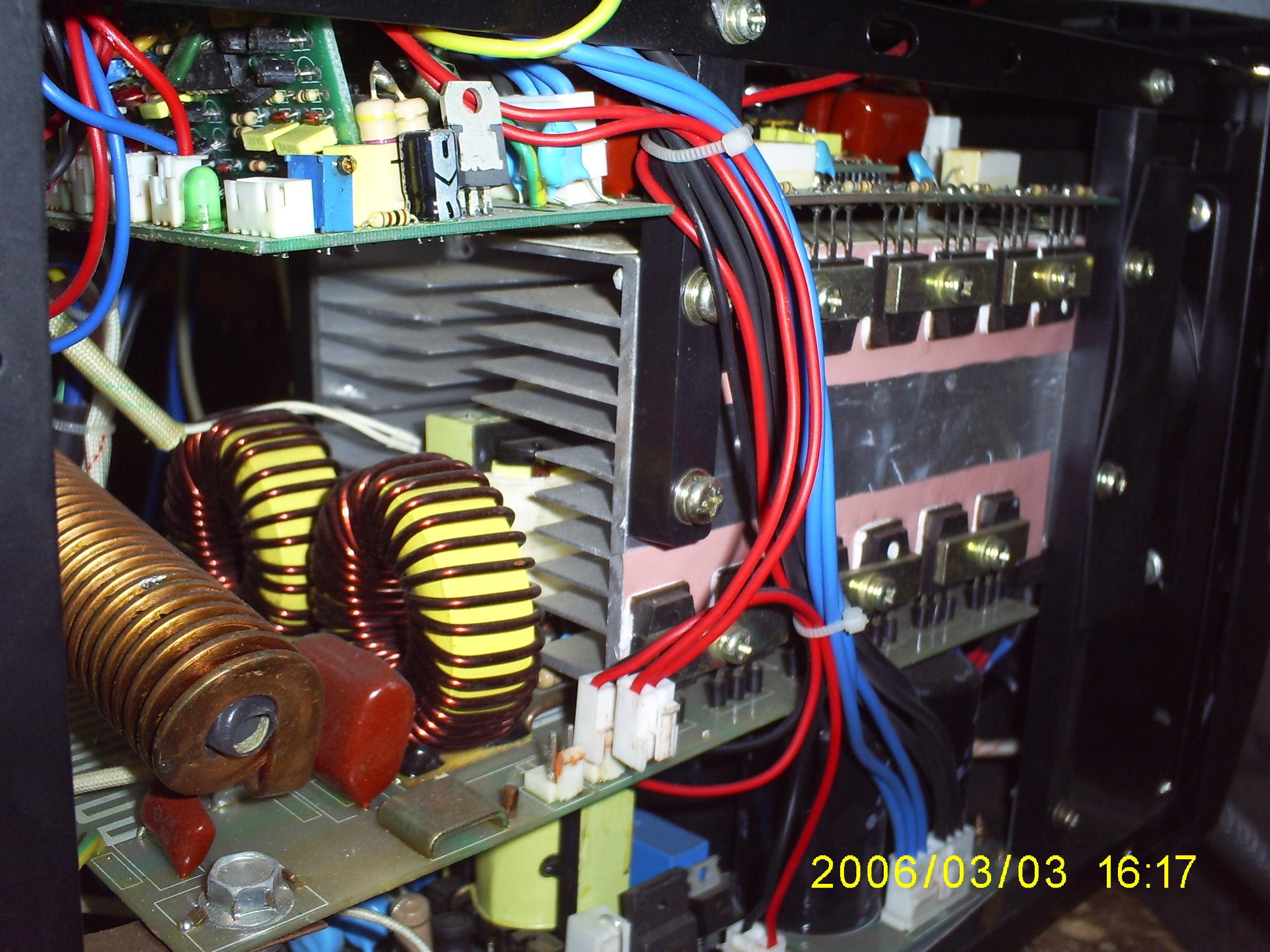 5-Pogled na izlazne induktivnosti i deo konstrukcije tunelskog hladjenja.Takodje se vidi solidan broj igbt tranzistora i dioda (jos toliko ih je sa druge strane) i ukoliko su korisceni 50 amperski tranzistori,trebalo bi da aparat zadovoljava podatke sa tablice na 40 stepeni (slobodna procena).