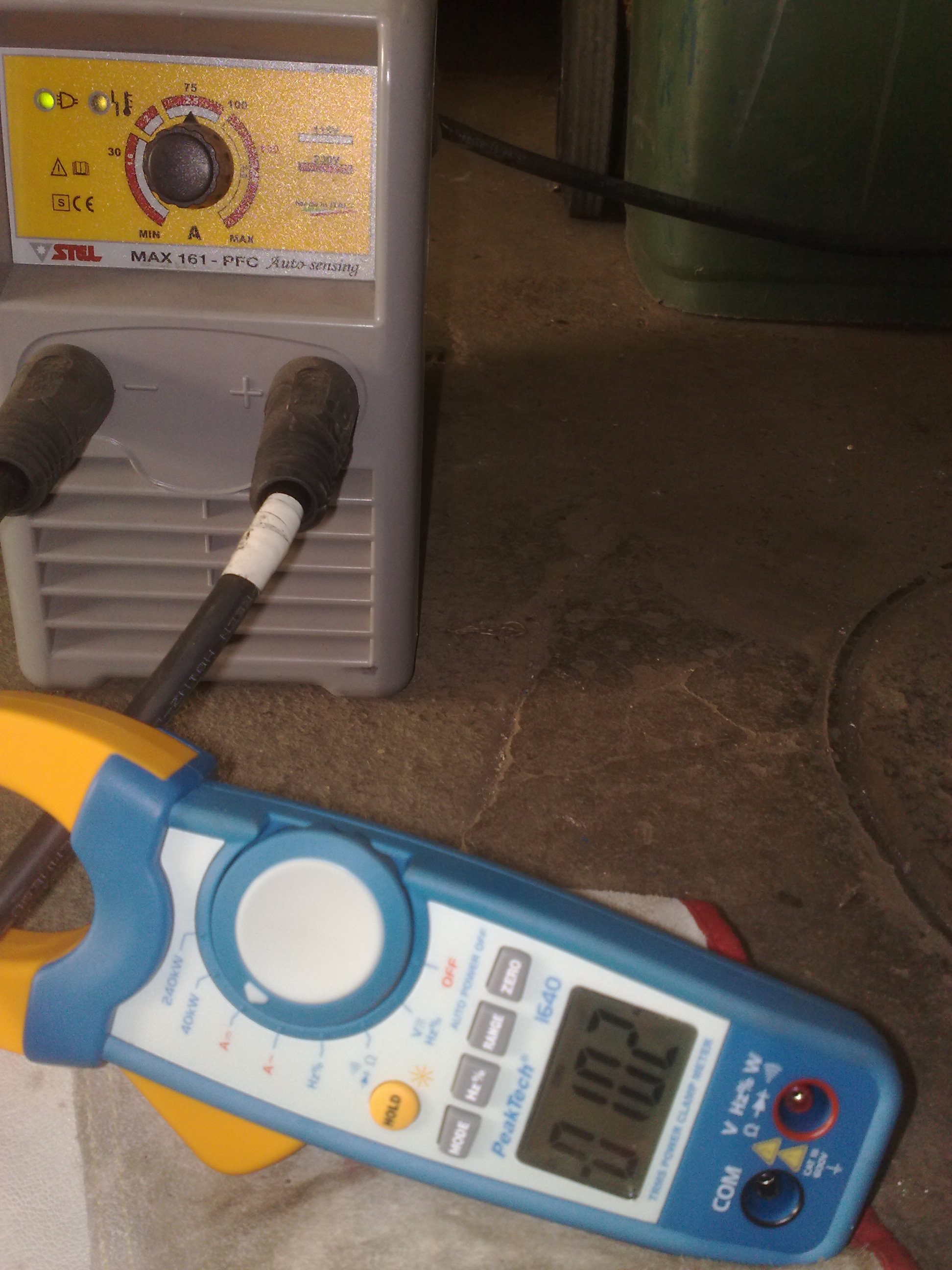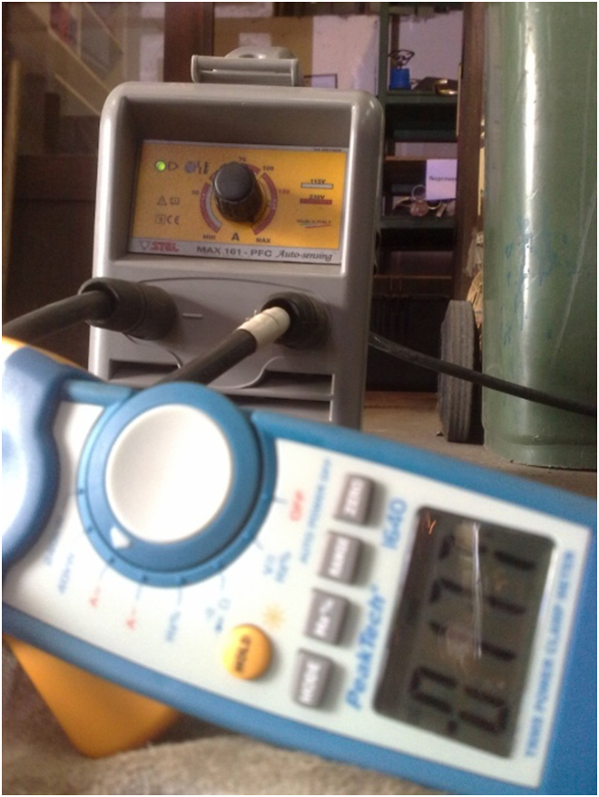 Evo slike naseg radionickog aparata. Vidi se da kada je aparat podesen na oko 75A amper klesta pokazuju 102A a kada je podesen na 145A, amper klesta u trenutku slikanja pokazale 177A. Neko moze pomisliti da je aparat neispravan, ili lose kalibrisan, ali nije, samo je nabijena elektroda do materijala, luk skracen maksimalno a aparat ukljucio svoj "digging arc force (kopajuci luk)" od nekih 25%-30% preko namestene amperaze.