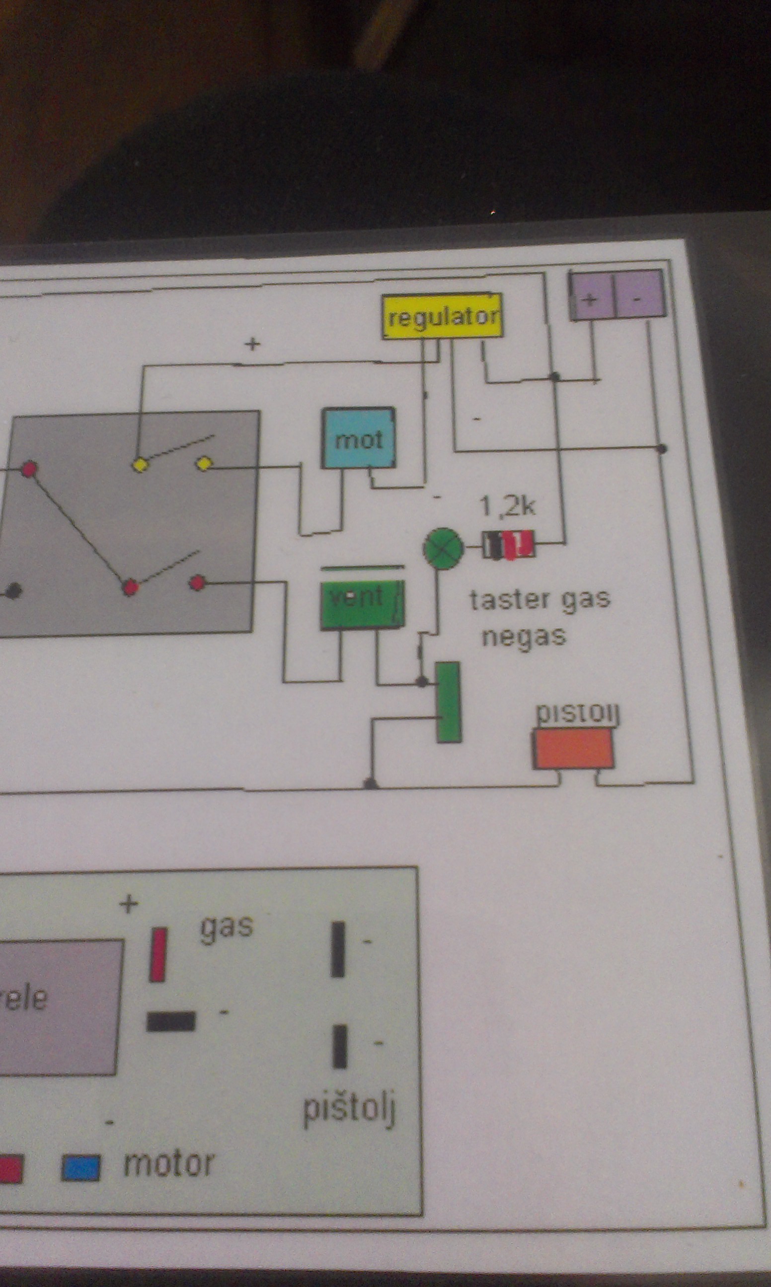 Vukklek, posle pwm regulatora odnosno izlaza na motor treba da je rele koji iskljucuje ili ukljucuje i gas i motor, a rele se startuje preko mikroprekidaca na pistolju.Upravo je kod mene u izradi zasebno vuca zice za CO2 i kacice se na Jasic tig 200 pro, opcija rel zavarivanje.Cekam jos da iz Kine stigne 24V DC elektromagnetni ventil jer ga kod nas nisam nasao, ostalo od motora, euro prikljucka, dinsi nabavljeno iz Subotice.Kad se zavrsi na prolece idu slike.Za napajanje relea, motora i ventila zaduzen je trafo jer je pouzdanija varijanta. Evo pripremljene el.sheme da se nalepi unutar kucista, pripremljeno sve i istestirano, ceka se da otopli .