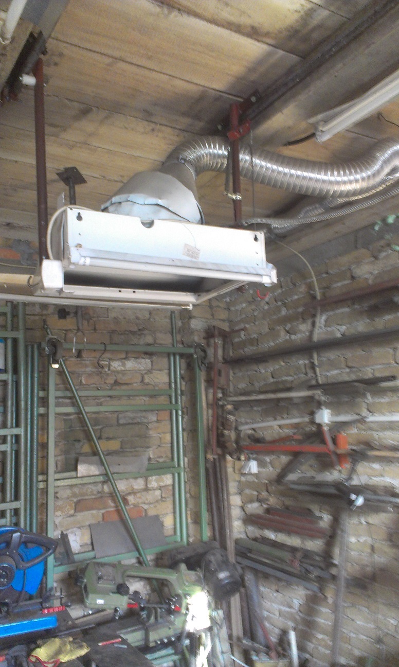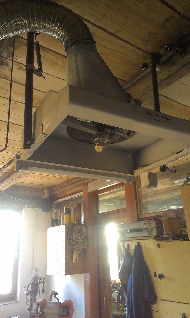 Да бих се решио штетних гасова одрадио сам себи апиратор и у ту сврху сам искористио основу кухињског апиратора, метални левак за клање пилића, вентилатор климе, лед цев од 60цм и алуминијумско црево фи120 за аспираторе.Окачен на две шине за померање по потреби до 1,7м, подесив је и по висини.Одлично ради посао, није бучан.