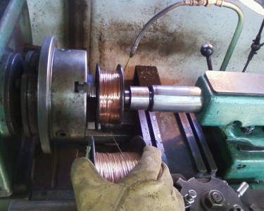 Evo Marko,alat je prost.Parce cevi6/4" zavareno na drsku strugarskog noza.Mali kotur stegnuti u amerikaner a veliki navuci na tu cev koja se stegne u drzac noza na suport.POvezati zicu i ukljuciti 200-300 obrtaja.Levu ruku drzati pripravnu na kvacilu a desnom(u rukavici)lagano kociti injerciju velikog kotura i pomerati ga po cevi levo -desno po potrebi kao sto radi ribolovacka masinica.Ide relativno brzo,pozdrav!