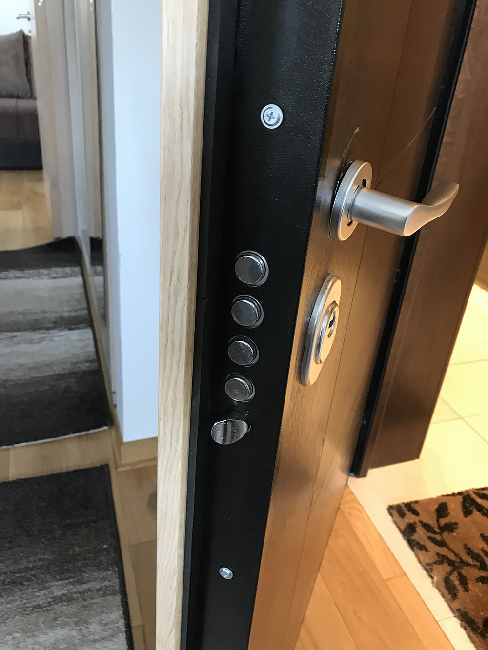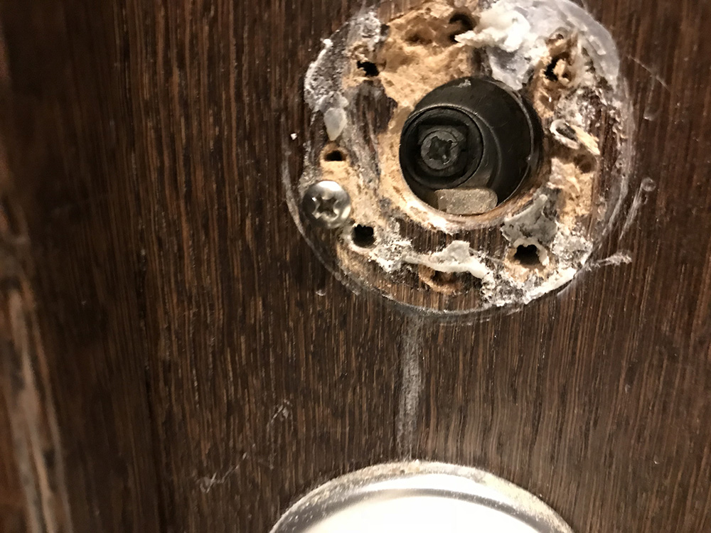 E sada, posto su vrata vrlo teska ta kugla sa spoljasnje strane se razlabavila, vise puta se otkacinjala, ponovo sam je srafio, lepio itd. Na vratima sada prakticno vise nema zdravog mesta u koje bi mogao da usrafim tu kuglu. Vrata imaju lim preko koga je neko tanko drvo tako da nema mnogo mesta u koja mogu da usrafim tu kuglu a da srafovi ne udare u lim. Takodje, mana ovog resenja je sto mi se desavalo da sa unutrasnje strane zaboravim kljuc u bravi i vrata se zatvore. Onda kljucem vrata ne mogu da otvorim a sa spoljasnje strane ne postoji kvaka i moram da "obijam" vrata plasticnom karticom kao u filmovima.