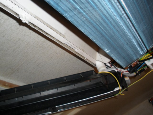 Kada se skine prednja maska unutrasnje jedinice,a za to je potrebno odviti 4-6 srafcica i paziti na "zubice",vidi se u podnozju jedna plasticna kadica oblika slova "v" u kojoj se sakuplja kondenz i odatle odlazi u odvodno crevo...E tu je prolem....servis to skine i opere a vi mozete to cistiti cetkom za farbanje uz pazljivo sipanje vode iz neke flase i paziti da sve lepo ode na crevo.Zbog raznoraznih naslaga u toj kadici(a ne bi ste mi verovali cega sve tu ima)nivo vode predje kritican nivo i prelije,pada na krilca ventilatora i on to "pljuje" napolje...bez obzira na to sto napolju otice normalna kolicina kondenza....