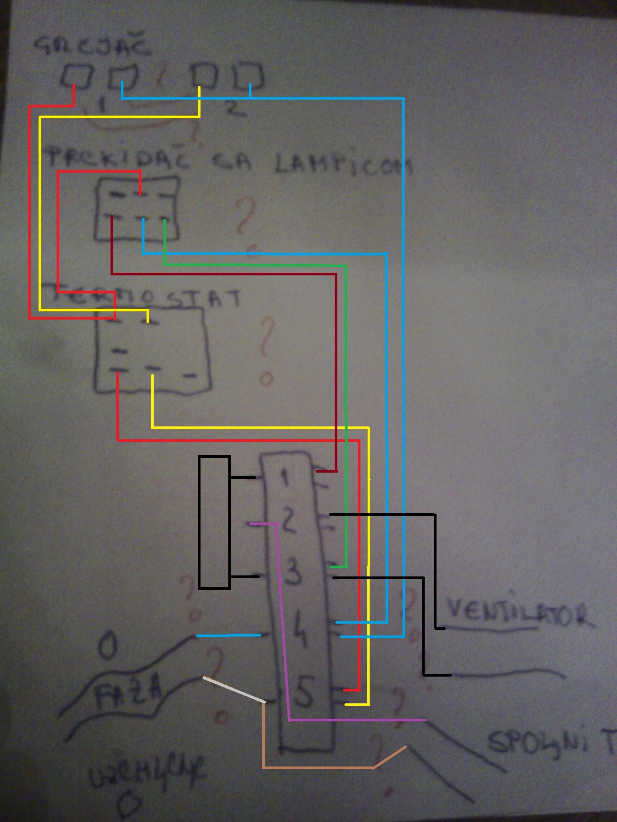 Evo vam povezano rukom na vasu sliku, to je to svaka zica je razlicite boje radi boljeg raspoznavanja, ukoliko niste sigurni sta da radite ili vam je nejasno bolje da ne rizikujete i da pozovete elektricara, ja sam pokusao da vam pomognem ali ne bih da vas nosim na dusi. Srecno i javite sta ste uradili