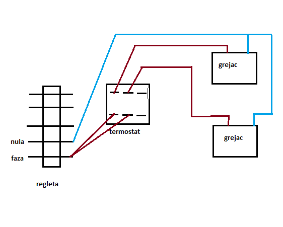 ova pec moze da ide i na trofazno i na monofazno napajanje, e sad kod monofaznog nacina povezivanja problem je u tome sto citava snaga ove peci prolazi kroz jednog kontakta, jedne zice, jedne faze a ovo je maksimalna snaga koja moze istrpeti monofazni prikljucak pa zato najstaje to grejanje koje dovodi do ostecenja kablova i kontakta. e sad ukoliko imate mogucnost prevezite je trofazno ali i da nemate trofazni prikljucak t.j. da morate da je povezete na monofaznim prikljuckom, vi povezite pec kao da je za trofazni prikljucak a to znaci da se svaki grejac napaja zasebnom zicom. idemo sad redom, za pocetak promenite tu porcelansku regletu na kojoj ide kabal, osteceni su kontakti i uvek ce praviti problem zbog loseg spoja. zatim povezite dve zice iz reglete koje idu na termostat, svaka na zasebni kontakt, pa iz termostata jedna zica ce ici ka jednom, a druga ka drugom grejacu. to su vam faze a nula ide kao zajednicka iz reglete direk ka jednom grejacu, a sa tog ide na drugom grejacu. OBAVEZNO osmirglajte kontakte do sjaja, srafove dobro pritegnite i na termostatu pored buksne, naravno i na klemama za grejace. to je to oko povezivanja grejaca da bi se rasteretili kontakti, e sad ukoliko imate trofazni prikljucak onda kod reglete dajete jednu fazu jednoj zici koja ide ka termostatu, a drugu fazu dajete drugoj zici. ukoliko mora na monofazni onda na te zice ide faza a nula kao sto sam rekao na tu jednu zicu koja ide direk na jednog grejaca a sa tog na drugog.u prilogi vam je sema za monofazno napajanje, za trofazno razdvojite samo faze kod reglete....