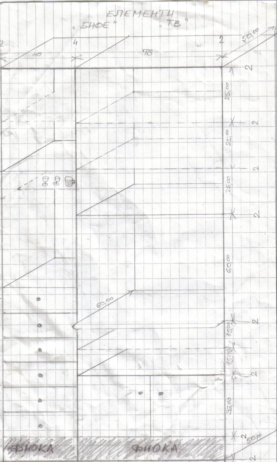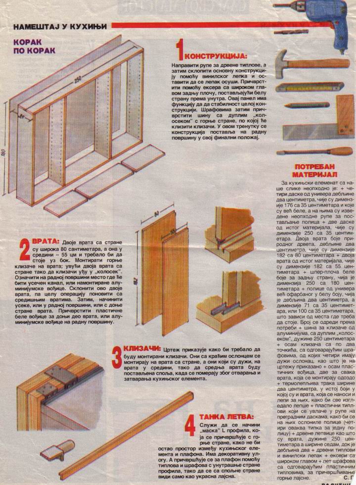 Sheme za izračunavanje su ti, pješke, gdje se lako pogriješi, stoga treba kontrolirati izračune, i računalni programi za projektiranje, koji su uglavnom komercijalni i skupi. ja ću ti napraviti izračun-krojnu listu, ali moraš neke stvari znati.Tko će ti bušiti rupe na vratima za spojnice-šarnire.Dali firma, gdje ćete naručiti materijal osim krojenja vrši i kantiranje rubova.Kako ćete spajati elemente, vijcima, drvenim tiplima i ekscentričnim spojnicama ili keksima (poseban alat).Ako ste još zainteresirani, javite se.