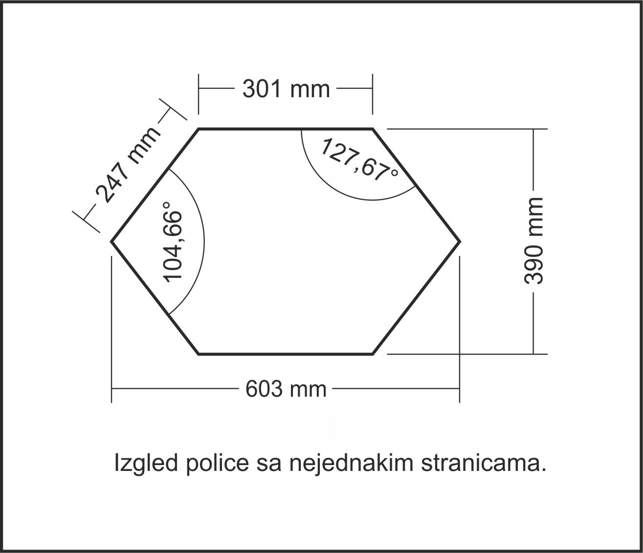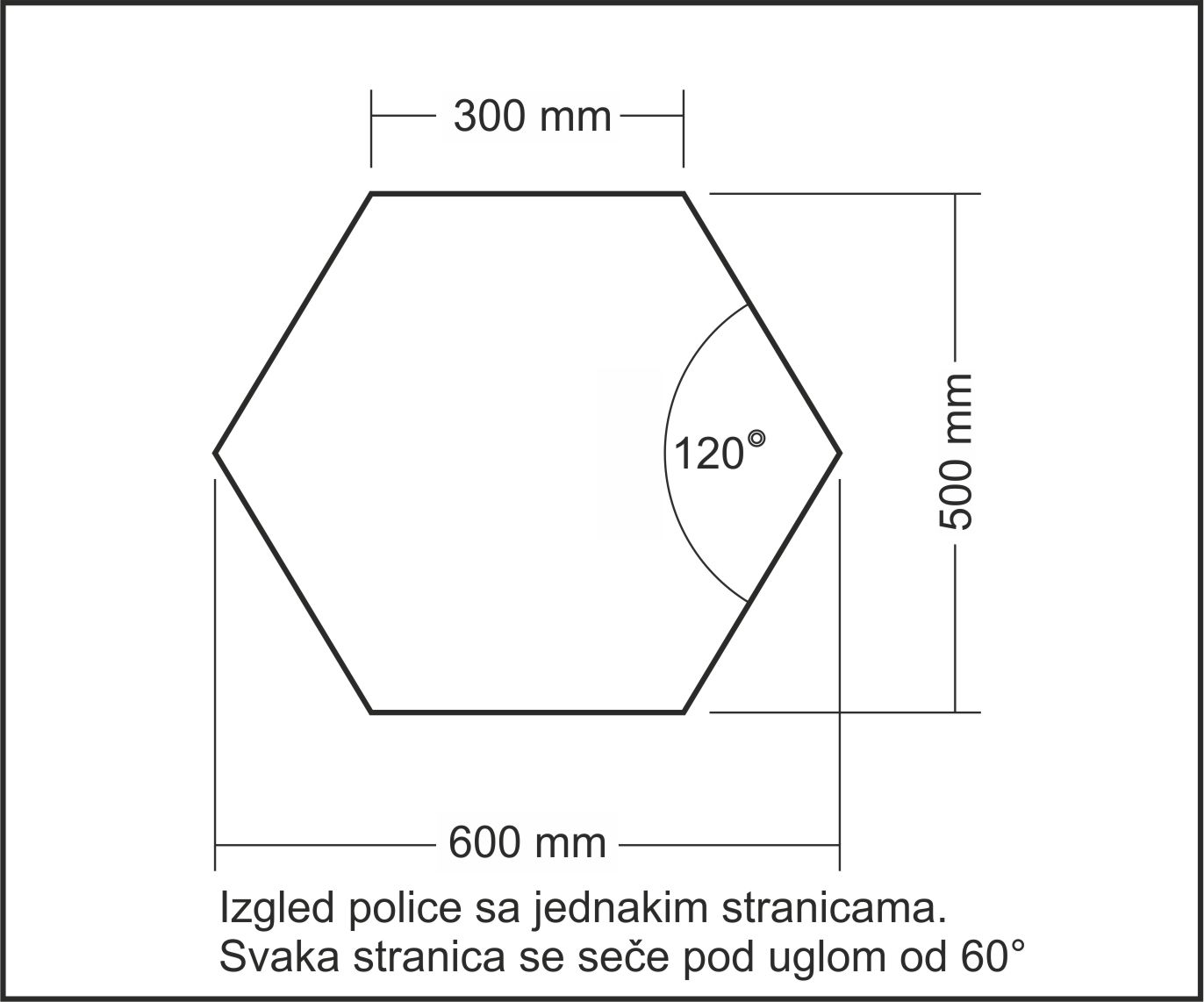 Zbir unutrasnjih uglova mnogougla 720°, ovaj mnogougao cine kvadrat i jednakokraki trougao.Kvadrat je stranica 50x50cm (stranice zatvaraju uglove pod 90°) i trougao 80° + 50° + 50°=180° za jednu trouglastu stranu +90°+90° uglovi kvadrata i to sve x dve stranice. Da bih dobio visinu sestougla od 50cm stranice jednakokrakog trougla moraju biti po 38cm za vecu policu, odnosno 35cm za manje: http://www.wolframalpha.com/input/?i=x+%3D+25%2Fcosinus%2850%29