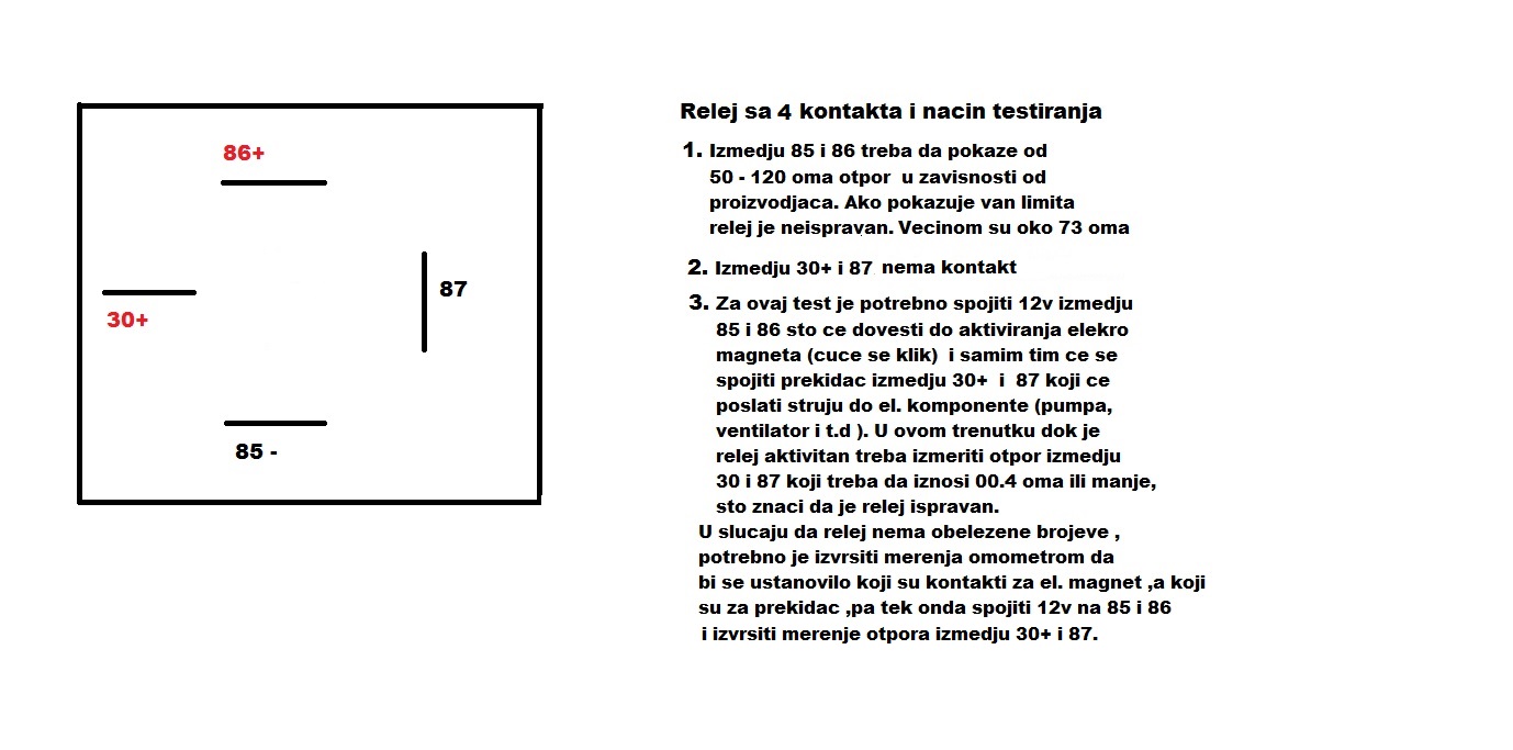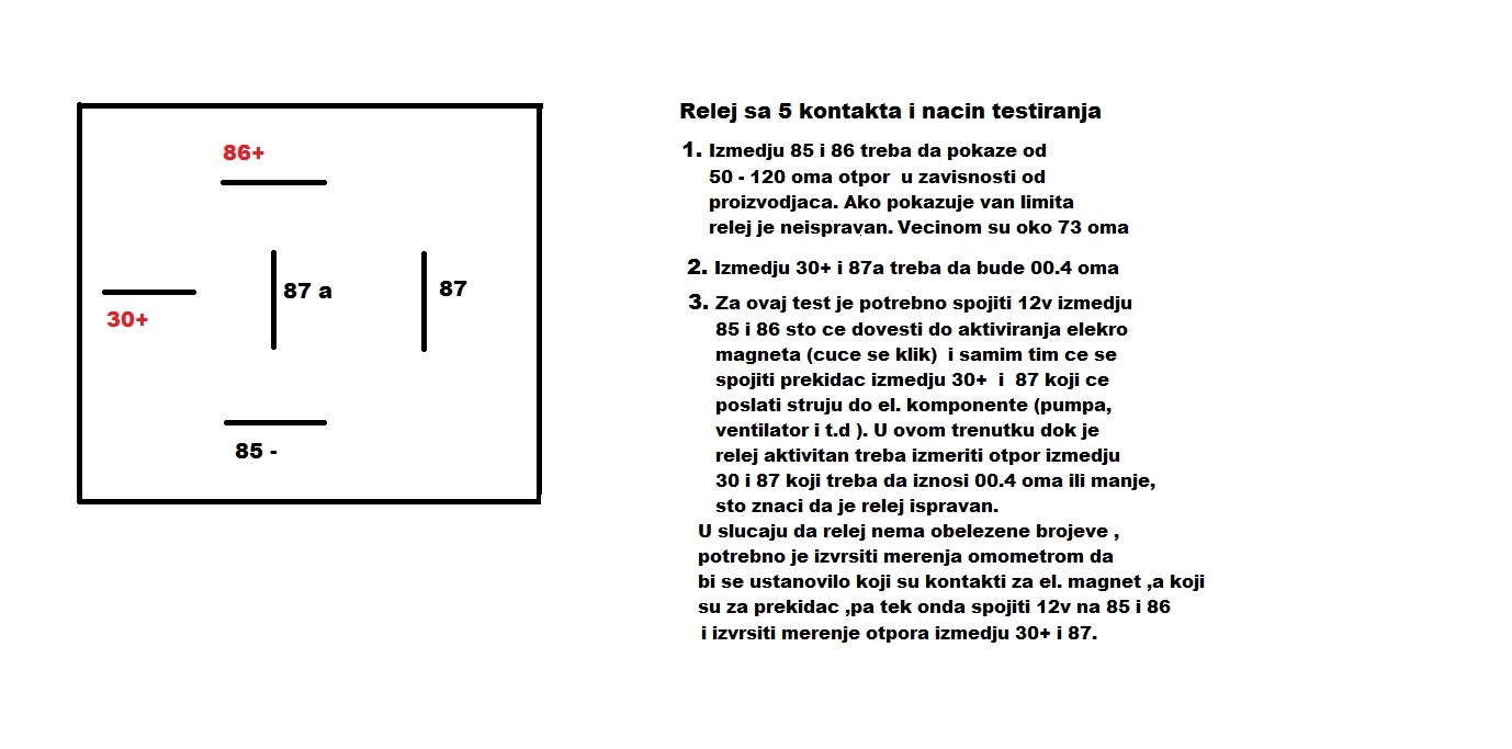 Kako proveriti ispravnost releja. Postoje releji sa 5,4 I 3 kontakta , Releji sa 5 I 4 se proveravaju merenjem otpora izmedju terminala 85 I 86 koji bi trebao da iznosi od 50 - 120 oma u zavisnosti proizvodjaca (obicno su oko 74 oma) .85 I 86 je el.magnet koji se aktivira sa 12v preko brave, prekidaca ili kompjutera (pumpu za gorivo) I privlaci prekidac u releju koli je izmedju terminal 30+ I 87 (terminal 30+ je uvek pod naponom od 12v kad je instaliran) . Od 87 terminal struja ide prema el.komponenti/potrosacu (ventilator,pumpa Ili nesto drugo ).Test se vrsi na stolu (izvadjen relej) .Spojiti sa akumulatora 12v na terminale 85 I 86 I pri tom spoju ce se cuti klik sto znaci da je prekidac spojen , zatim izvrsiti merenje otpora izmedju 30+ I 87 pri kome bi trebalo da pokaze oko 00.5 oma ili manje. Pri ovom testu , multimetar je ukljucen na skali od 200 oma .U slucaju da relej pokazuje van limita 50-120 oma ili vise od 00.5 oma relej je neispravan. Releji sa 3 terminala su drukciji I samim tim se test vrsi na drugi nacin. Da napomenem : iako se relej cuje da klikce ,nemora da znaci da funkcionise pravilno .On klikne ali kontakt moze biti nedovovoljan/zaprljan I samim tim moze dovesti do pada voltaze u tom strujnom kolu.