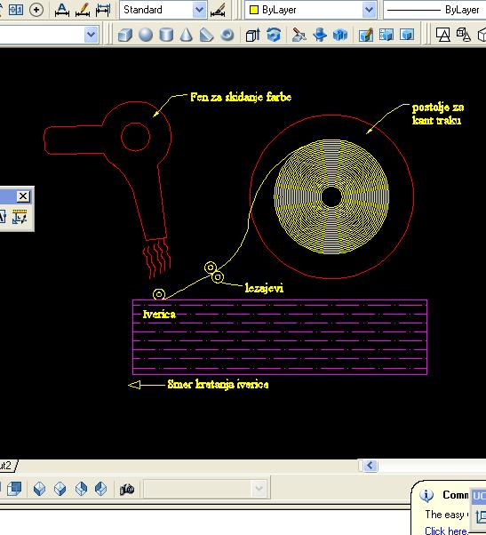 e sad, ovo sto sam nacrtao (po secanju) se, mislim, isplati kad kantujes dugacke komade iverice za plakare i sl. jer ti momci koji su kantovali su ,po nekoj mojoj slobodnoj proceni, taj komad iverice iskantovali mozda 3-4 puta brze nego sto bih ja to peglom uradio, a imam dosta iskustva sa kantovanjem, radim to vrlo cesto. losa stvar je sto su potrebne dve osobe za rad sa ovim, jedna ce pridrzavati ivericu a druga namestiti i pridrzati kant traku i ukljuciti fen. odsecanje viska kant trake se vrsi rucno, naravno. postolje na kom je smesten kolut sa kant trakom je takodje uradjen na lezajevima kako bi se kant traka lakse odmotavala. nista te ne kosta da isprobas, sve mozes napraviti od stvari koje verovanto ves imas kod kuce.