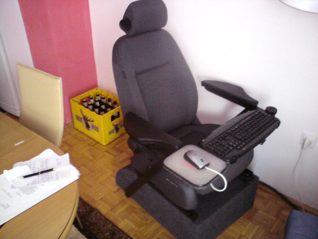 Kućište je u postolju ispod stolice, a ono žuto iza je UPS (Uninterruptible power supply)!