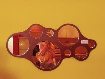 Osnova je od neke vrste iverice, a na nju su nalepljena okrugla ogledala raznih dimenzija. Nasla sam firmu koja ima tu ivericu u svim mogucim bojama, teksturama, dezenima i koja sece sve to po meri. Pritom imaju i odgovarajuce kant trake da bi se oblepile ivice.