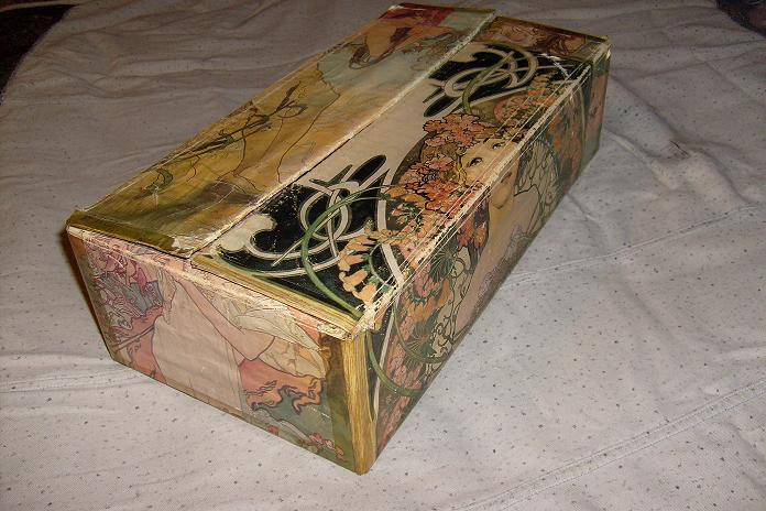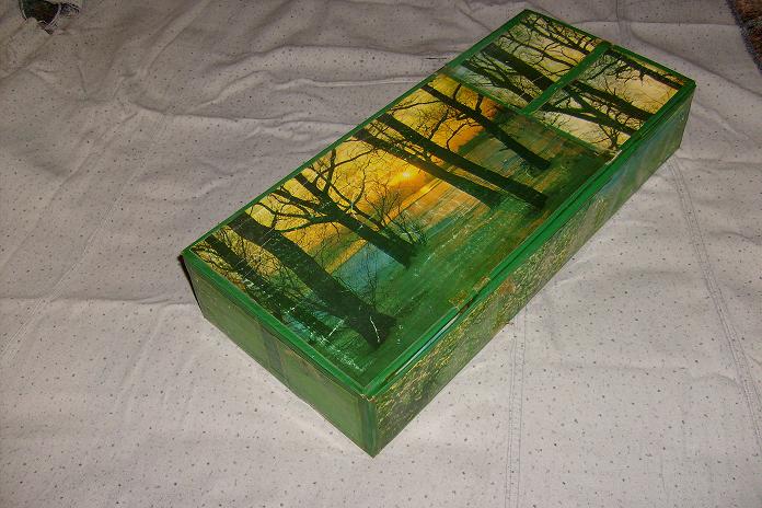 Pravi se lako treba vam drvofiks,disperzija,tempera i lak u spreju.Ako je plastificirana kutija ili ima onaj tanak sloj folije to ogulite pa ofarbate temperom ili disperzijom mesanom sa malo drvofiksa pozadinu,ostavite da se osusi i slikate sta vam padne na pamet kada se slike osuse izlakirate i to je to.