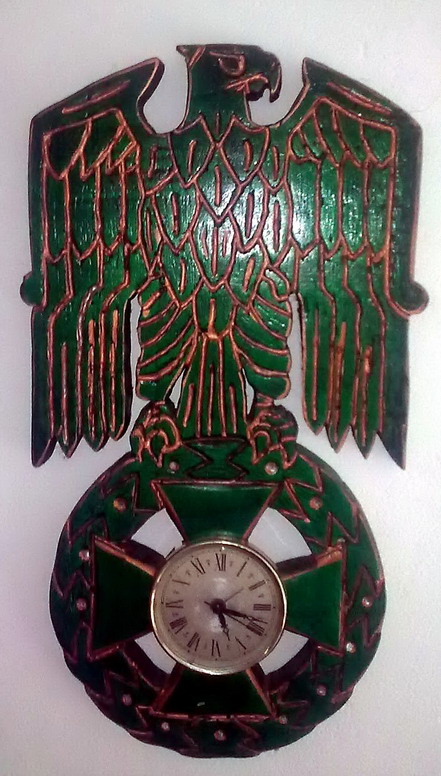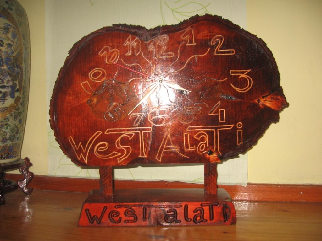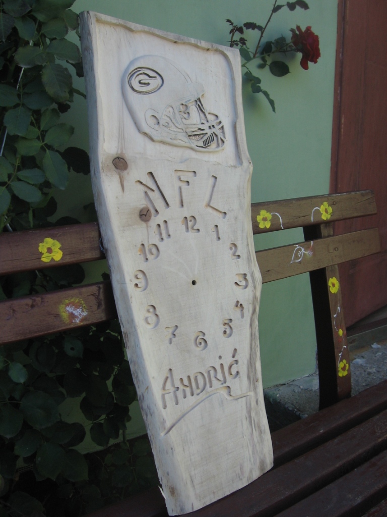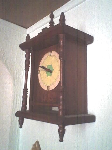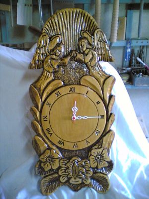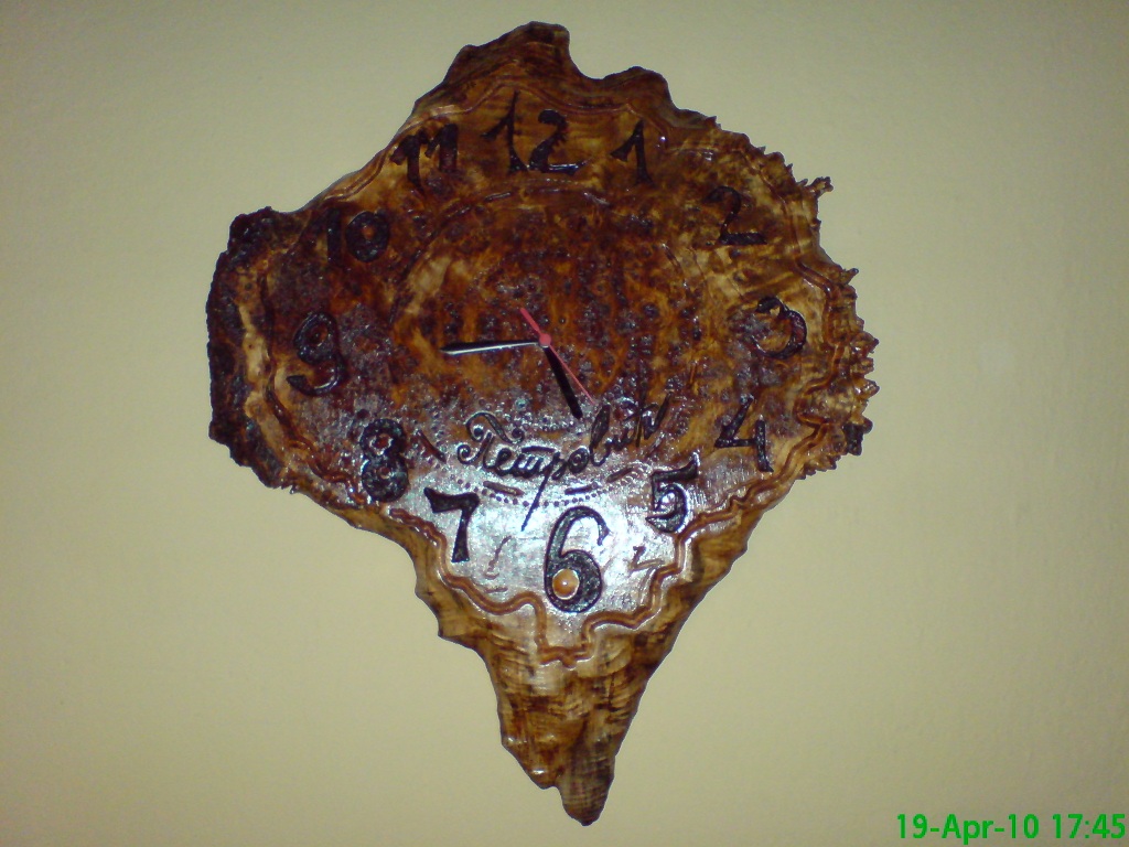 Ideja je bila negdje odprilike prije 20-tak godina da napravim mini strug za izradu plovaka za ribolov i kad sam ga napravio prvo što je bilo to je da napravim ovaj zidni sat,mehanizam je kvarcni a u donjem djelu su bile imitacije tegova ali ih sad nema.
