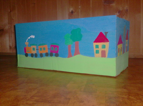 Ja nemam decu ali ih ima moja sestra. Starije tetkino zlato je prosle nedelje dobilo novu kutiju za igracke posto se prethodna korpa raspala. Sve sto vam treba je obicna kartonska kutija i tempere