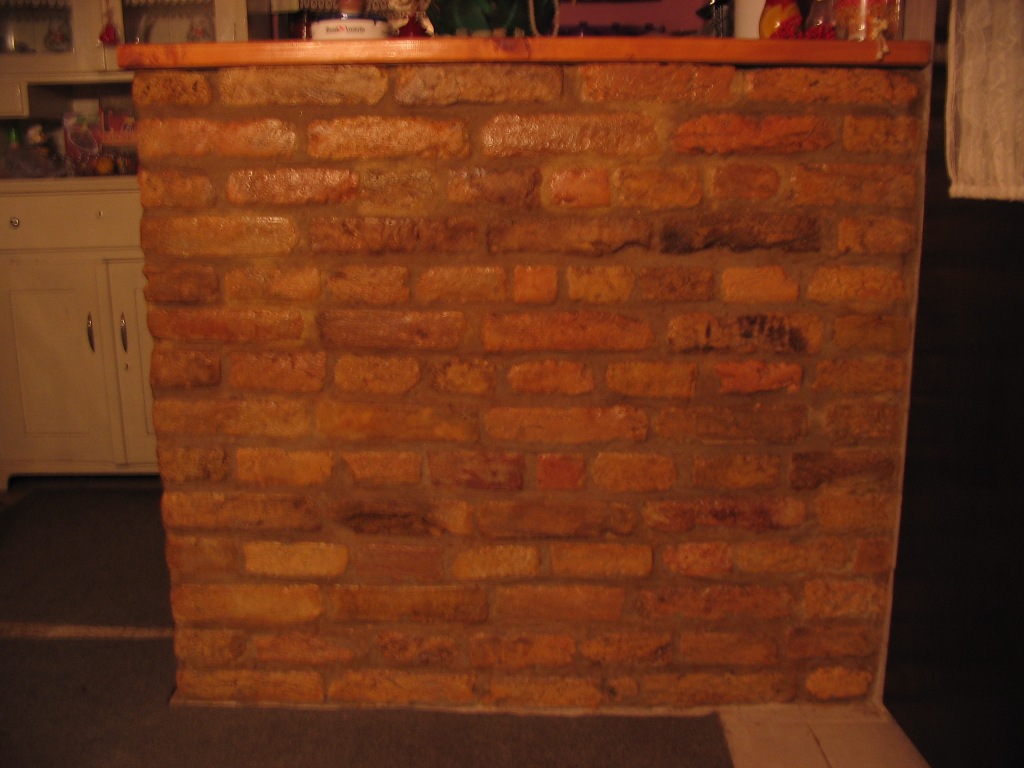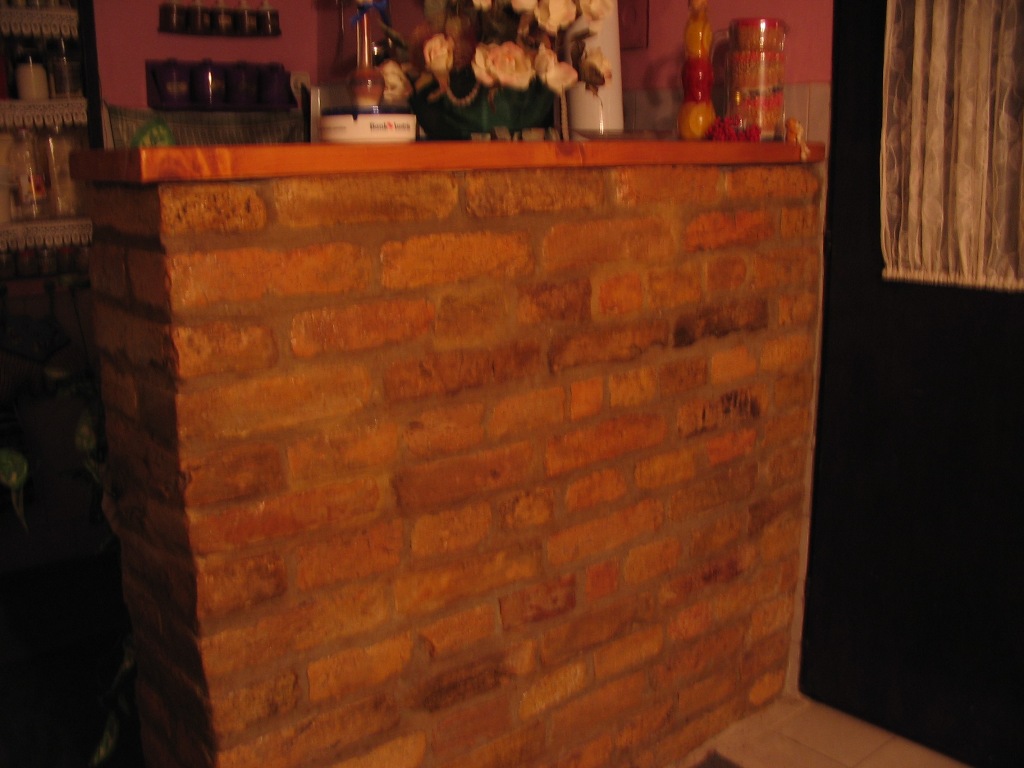 Šank sam zidao od stare tzv. Švapske cigle velikog formata, mada je to moguće i sa novom ciglom ali je meni ova mnogo lepša jer je različitih boja i teksture (vide se napuknuća, okrnjene i iskrzane ivice). Ciglu sam prvo očistio i ostrugao čeličnom četkom. Nakon zidanja šank sam tretirao staklenom vodom da suvišna vlaga nebi probijala na površinu i na kraju prelakirao običnim lakom za čamce. Daska na šanku je od topole, debljine 2 cola sa obrađenim ivicama, takođe prelakirana.
